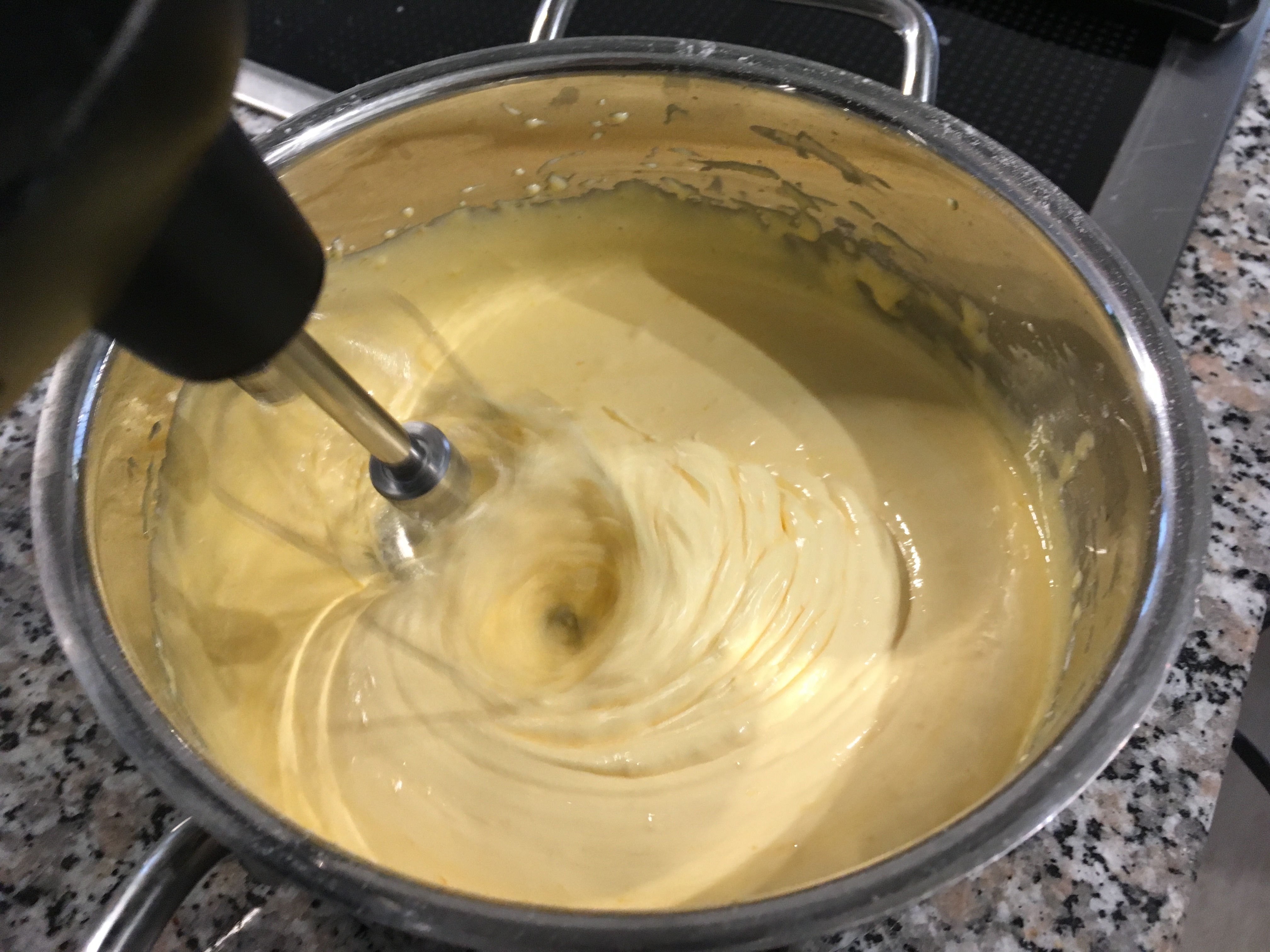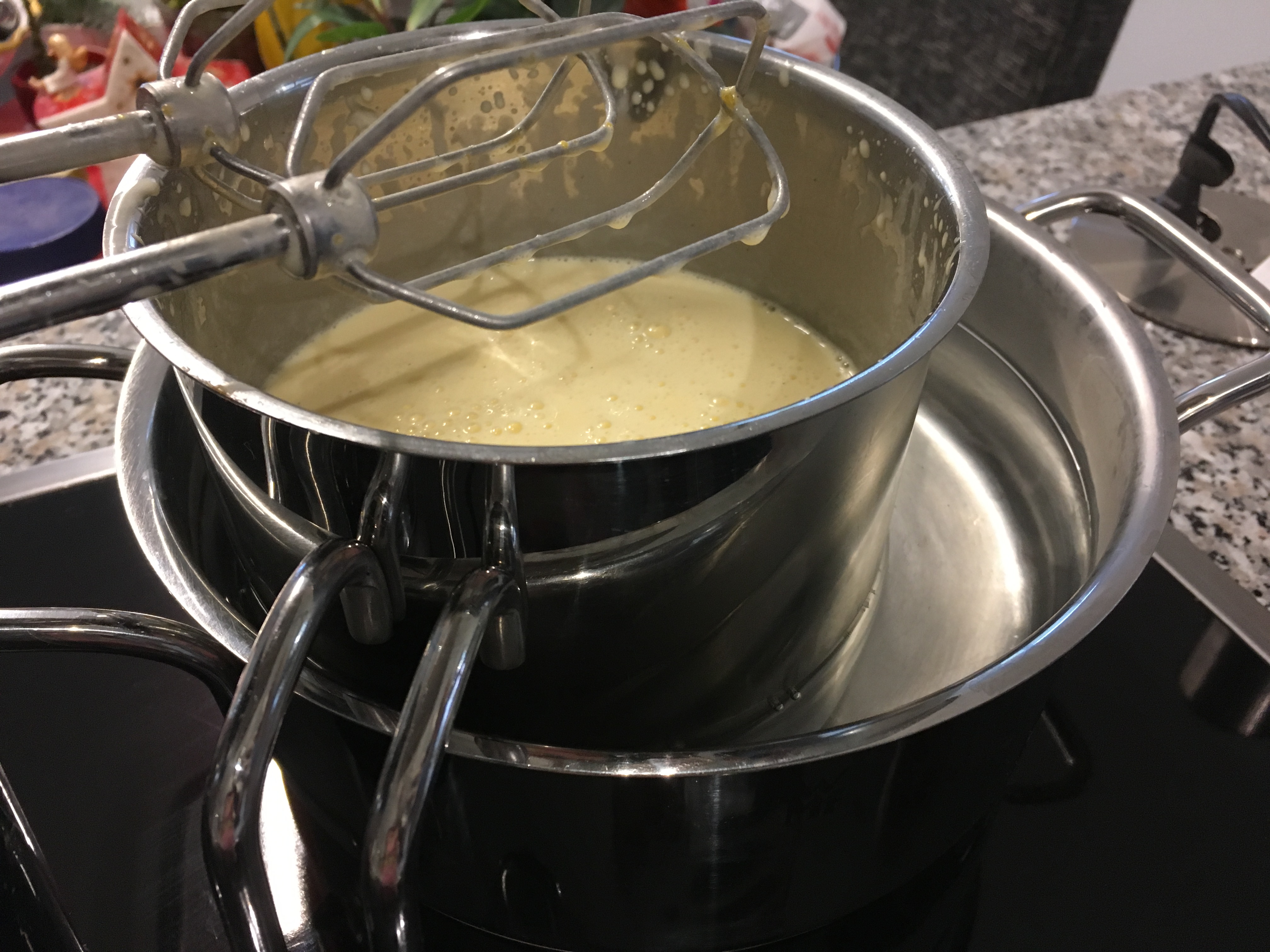 - Eigelb und Puderzucker in einem mittel-großen Topf mit den Quirlen eines Handrührers circa 5 Minuten cremig rühren.