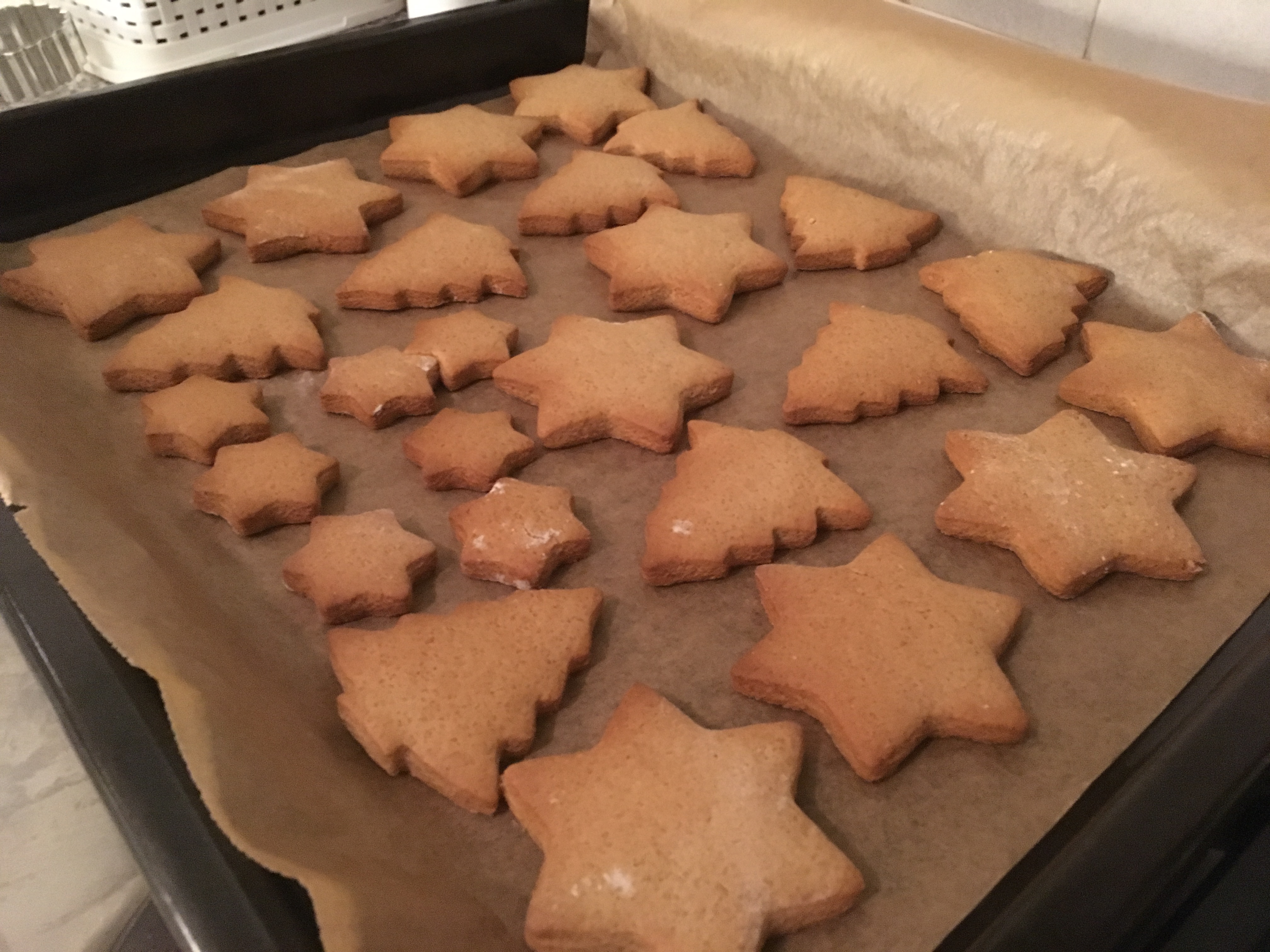 gebacken - Zubereitung Zuckerguss: Für den Guss das Wasser mit dem Puderzucker glatt rühren und die abgekühlten Lebkuchen damit bestreichen. Mit 1 EL Wasser anfangen, dann einen weiteren EL dazugeben; ggf. sogar 3 EL (wie bei mir).