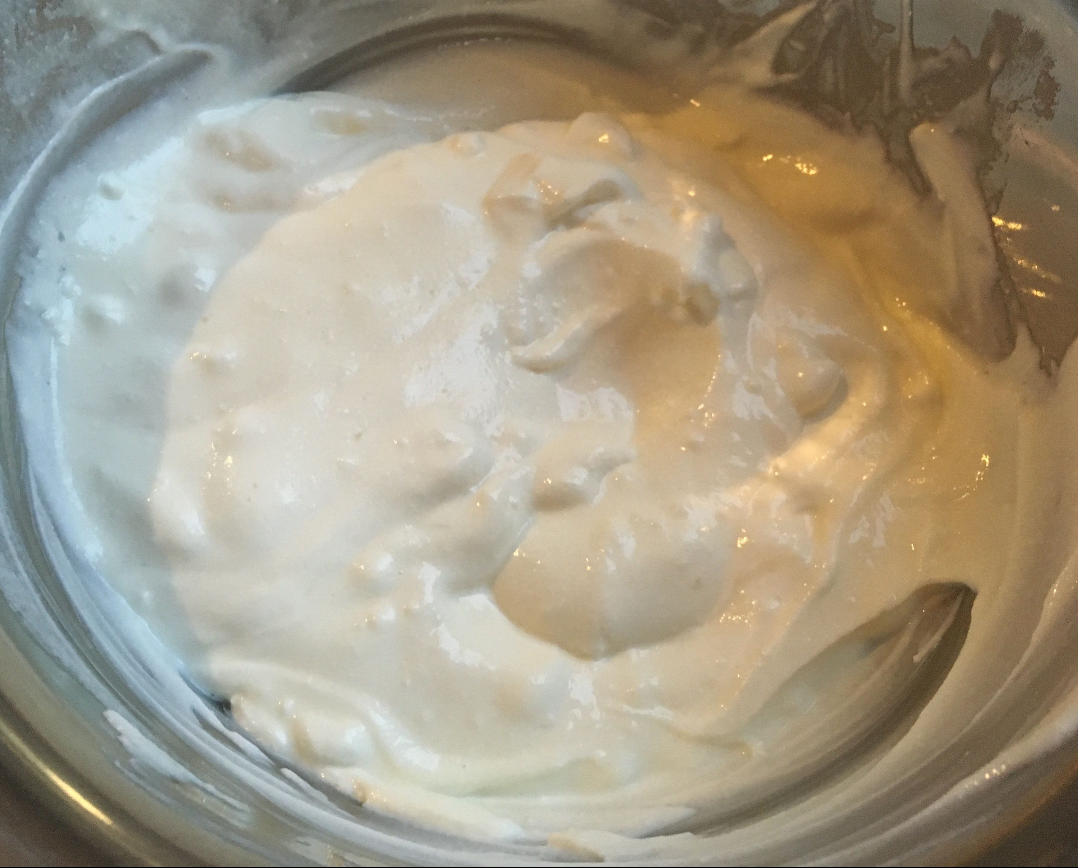 10. Um der Creme den nötigen Halt zu geben, werden 3 oder 4 Esslöffel (8EL) Wasser oder Saft auf dem Herd zum Kochen gebracht, und das Agar-Agar wird hineingerührt – der seltsame Geruch ist normal. Sobald die Flüssigkeit geliert, wird sie zur Joghurt-Quark-Mischung gegeben und gut untergerührt. Sofort in den Tortenring gießen und kalt stellen. Wichtig: 1. Das Agar-Agar mit dem Wasser vermengen, erst dann 2. aufkochen.