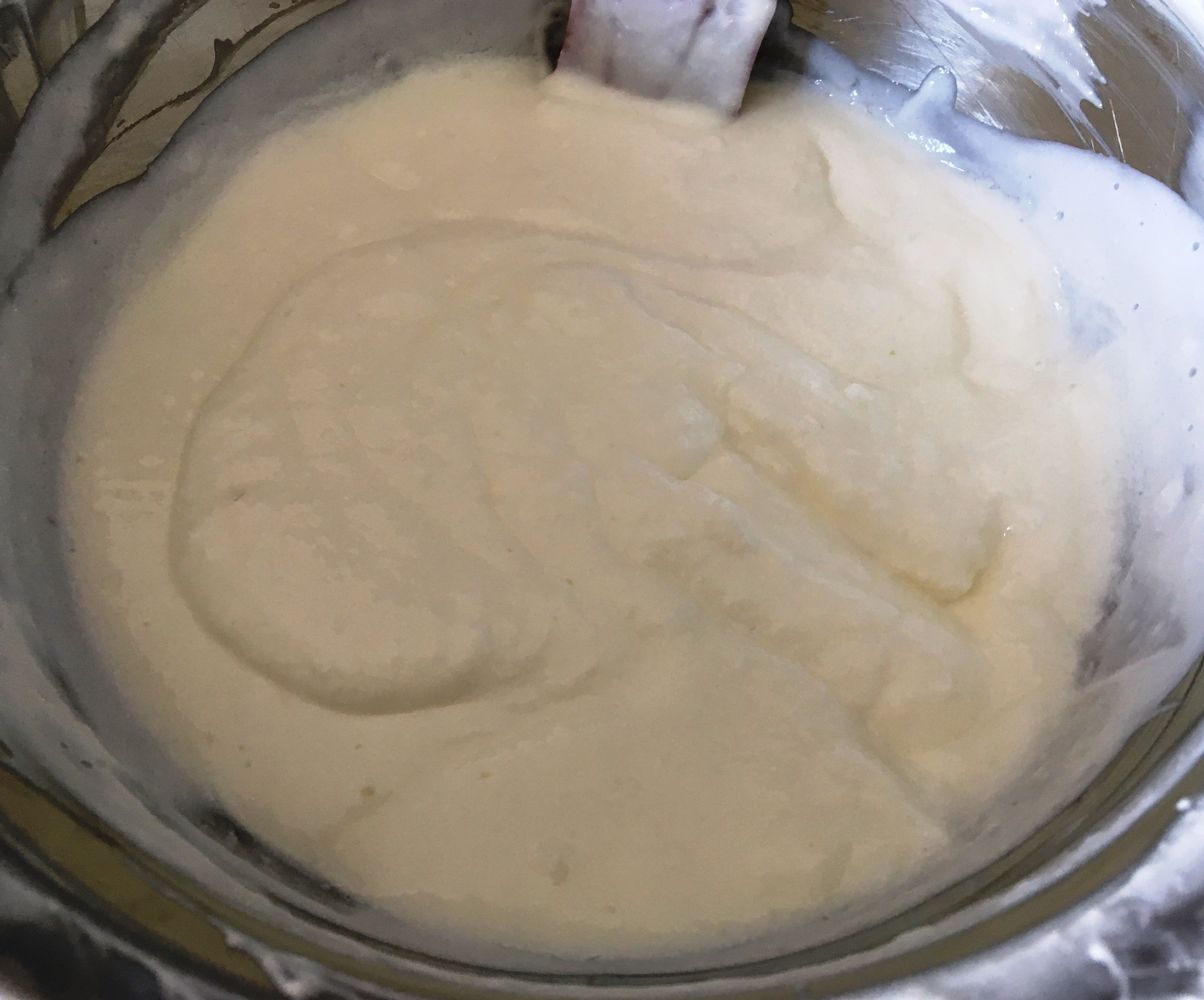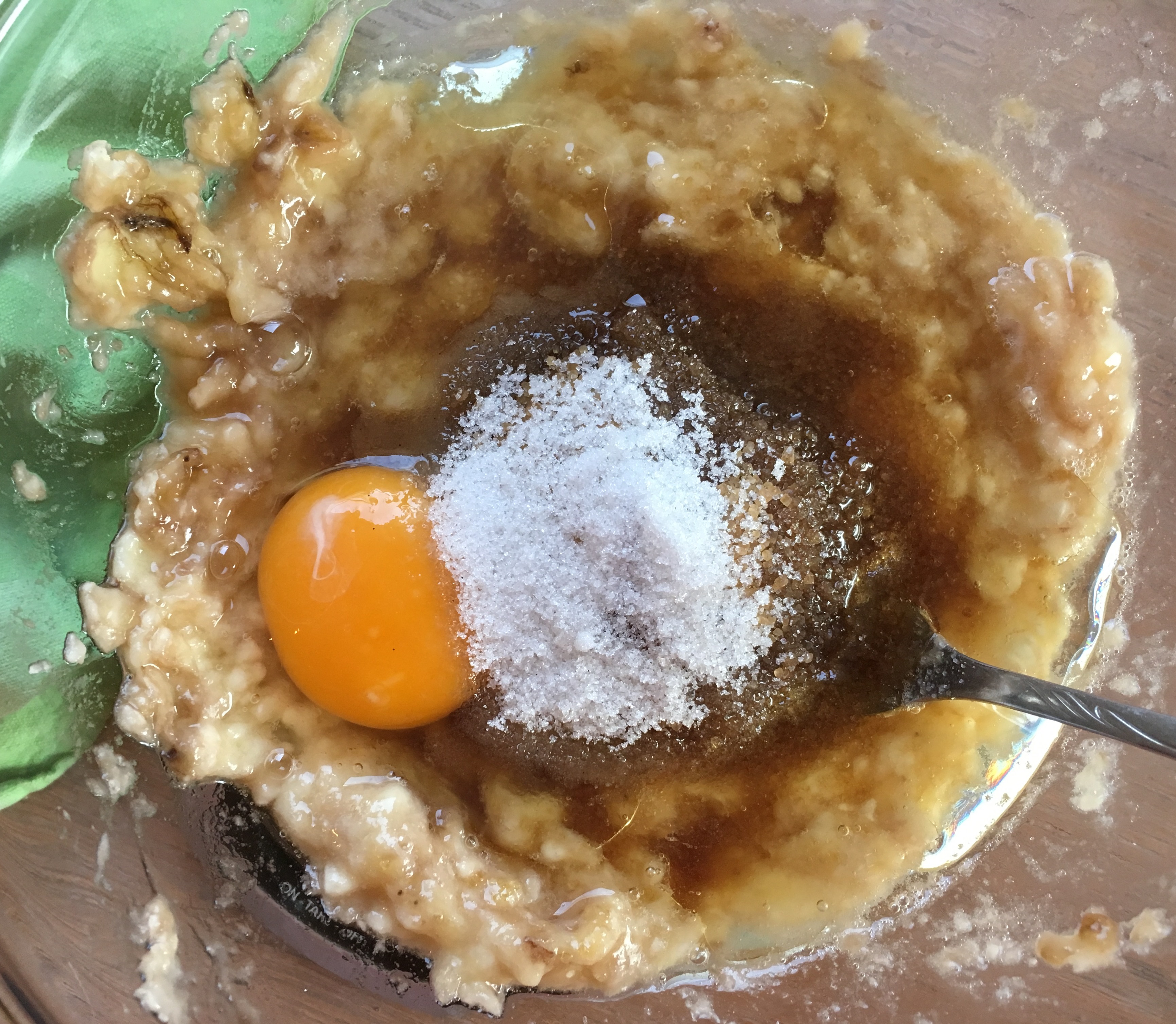 4. Das Mus mit Zucker, Vanillezucker, Salz, Ei und Öl zusammenrühren, dann das Mehl dazugeben und vermischen.