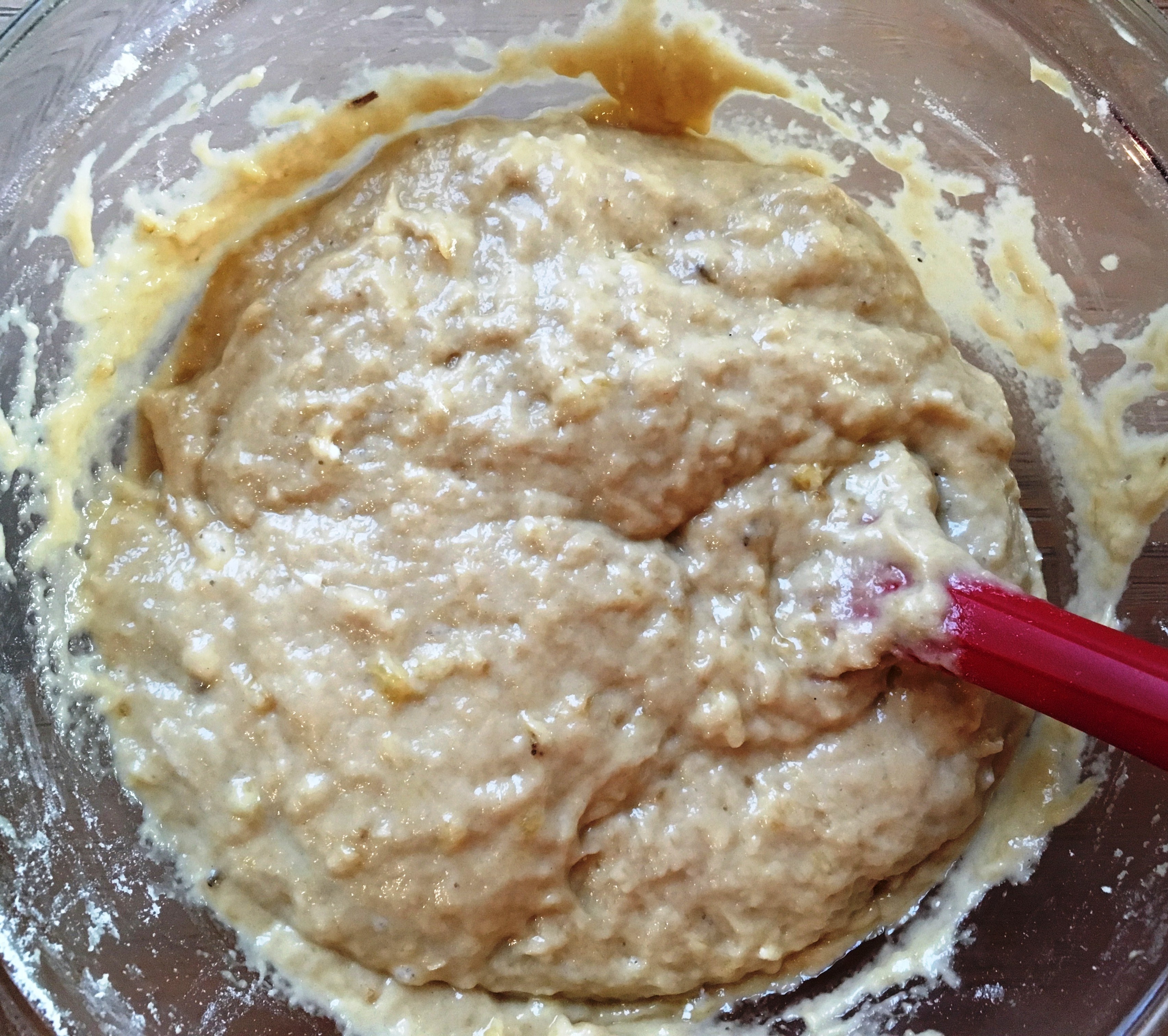 Bananen schälen Bananenmus - Das Mus mit Zucker, Vanillezucker, Salz, Ei und Öl zusammenrühren, dann das Mehl dazugeben und vermischen.