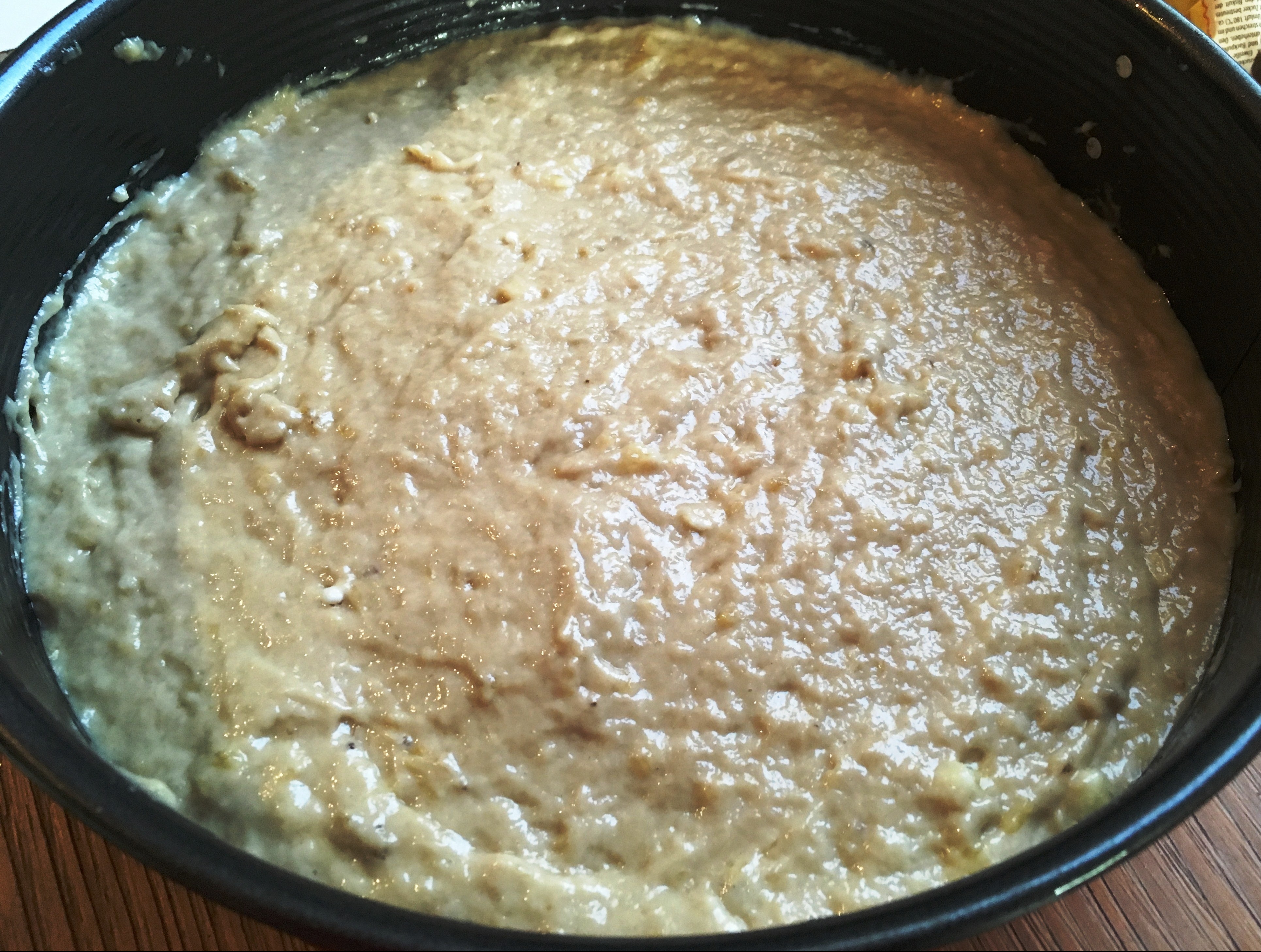 5. Den recht flüssigen Teig etwa einen Daumennagel hoch in eine mit Öl eingefettete Springform füllen. Ich habe ein ∅26cm Springform genutzt und hatte dennoch mehr Füllung, als einen Daumennagel hoch. Geschadet hat es nicht 😉