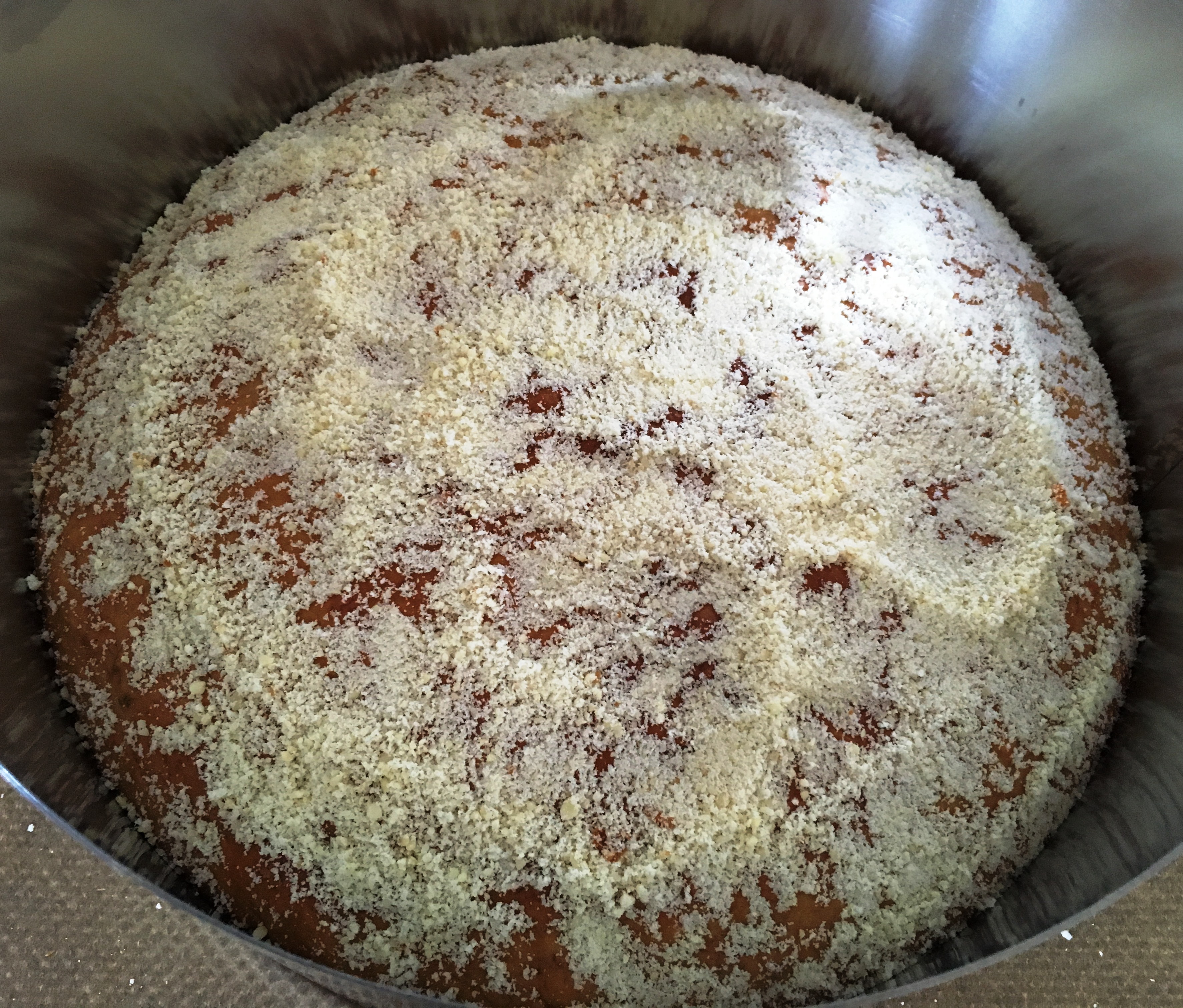 7. Nun werden die geriebenen Mandeln auf dem Tortenboden verteilt. Abgesehen vom guten Geschmack dient diese Schicht dazu, Flüssigkeit aufzusaugen, damit der Tortenboden nicht durchsuppt. Statt Mandeln kann man auch gehackte Nüsse oder Kerne verwenden.