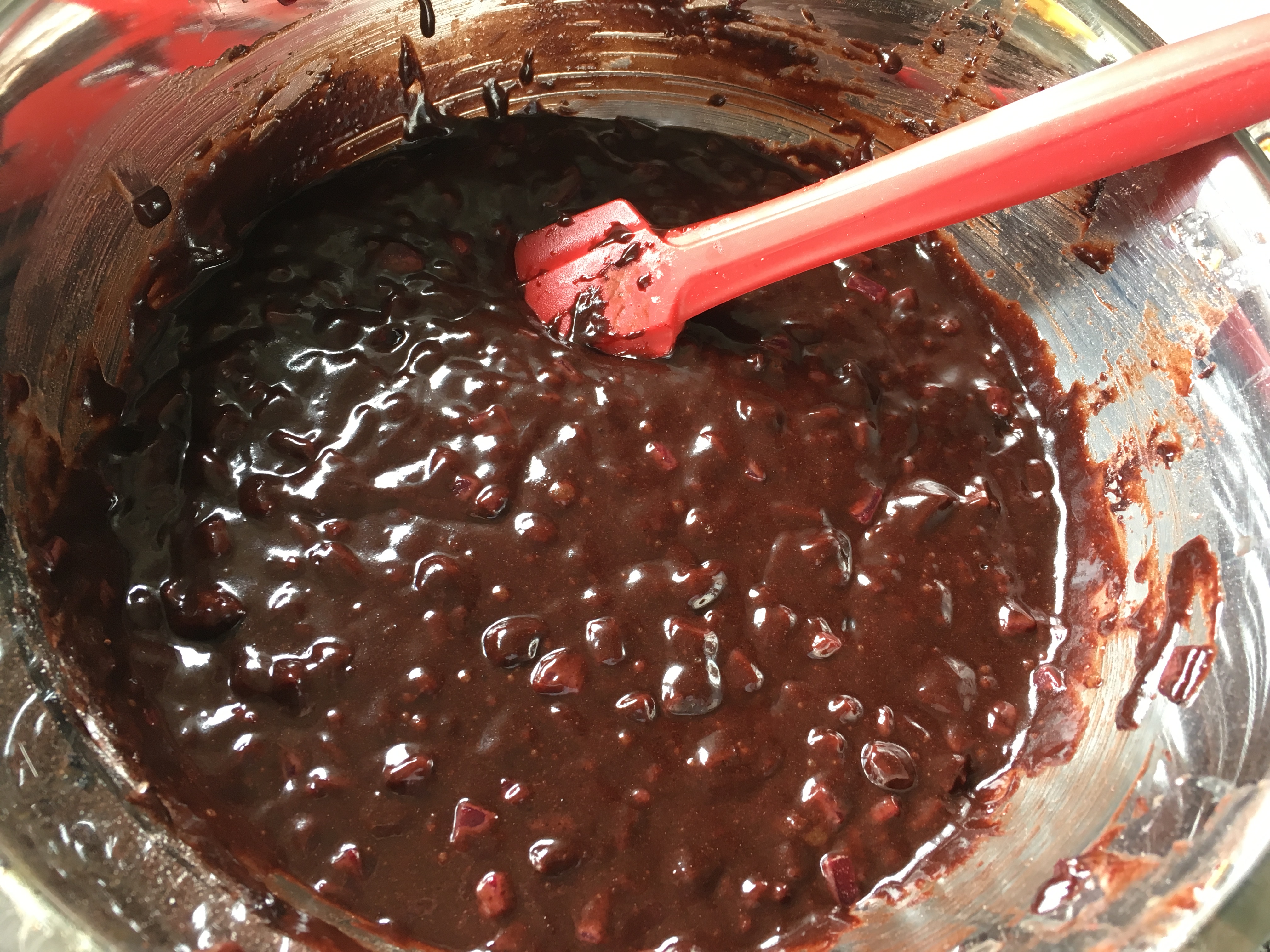 Zugabe von Vanille, Kakao, Mehl und Backpulver Zugabe Rote Bete Teig verrühren - Den Teig in eine gefettete, eckige Kuchenform geben und ca. 50 bis 60 Minuten backen. 55 Minuten 🙂 Mit einem Zahnstocher testen, ob der Kuchen innen fest ist.