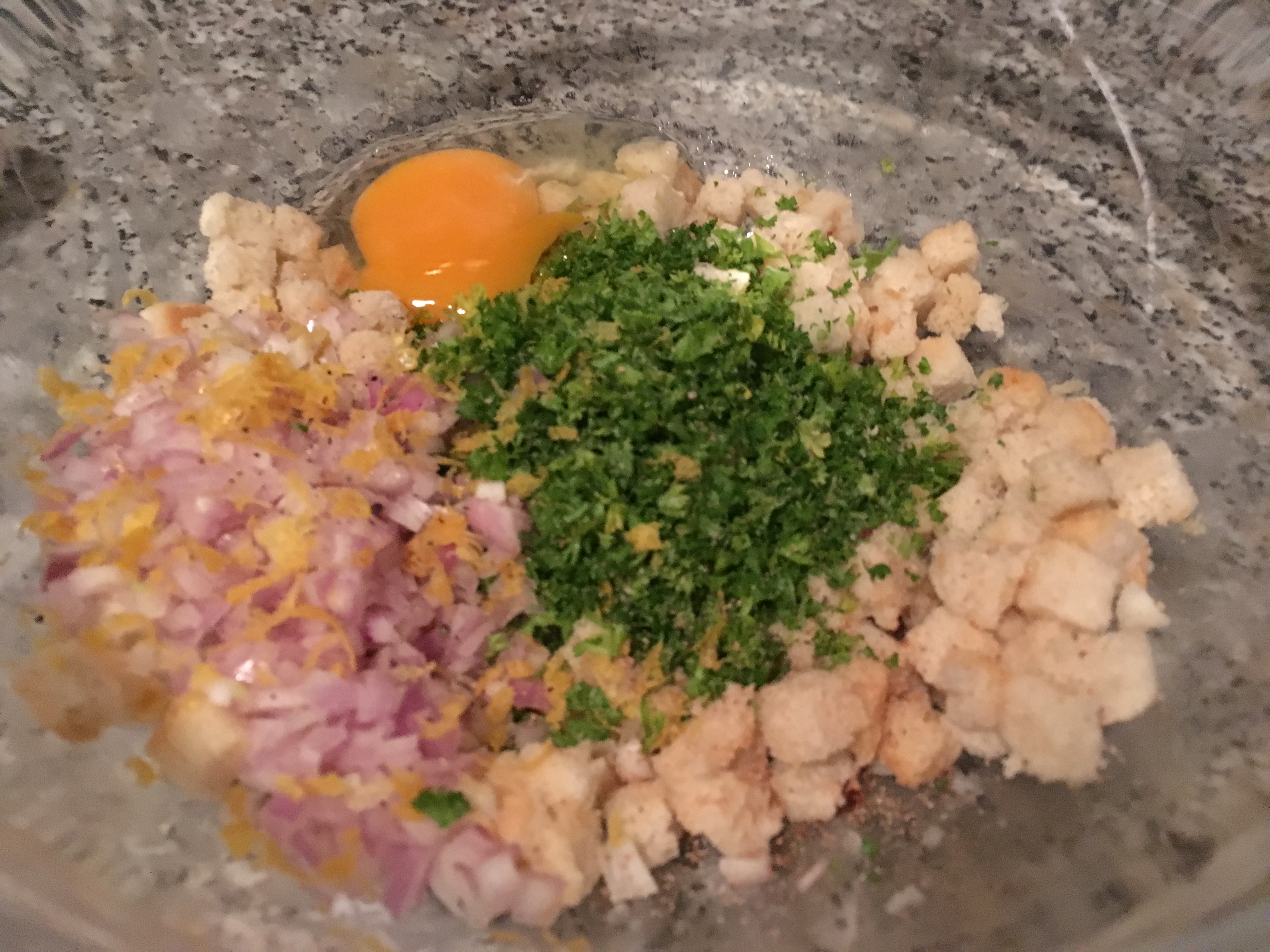 vermengen Alternative Semmelbrösel mit Milch Petersilie zugeben Zwiebel würfeln würzen, Zitronenabrieb Ei zugeben - Dann formt man mit nassen Händen Knödel und drückt sie flach.