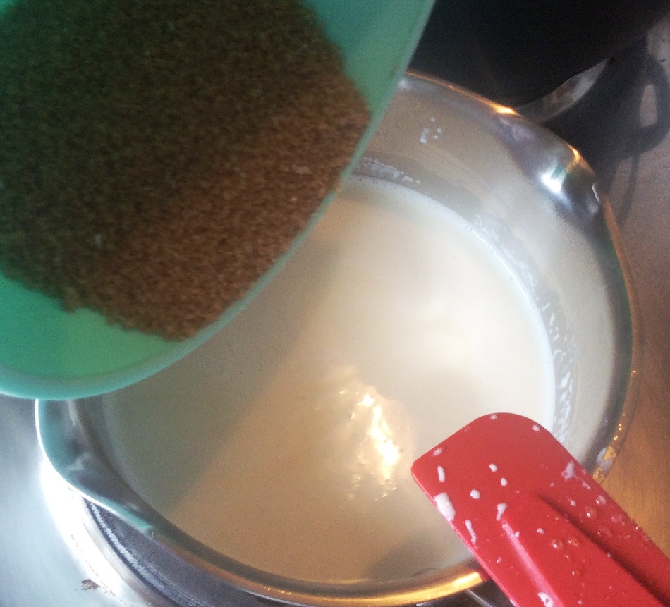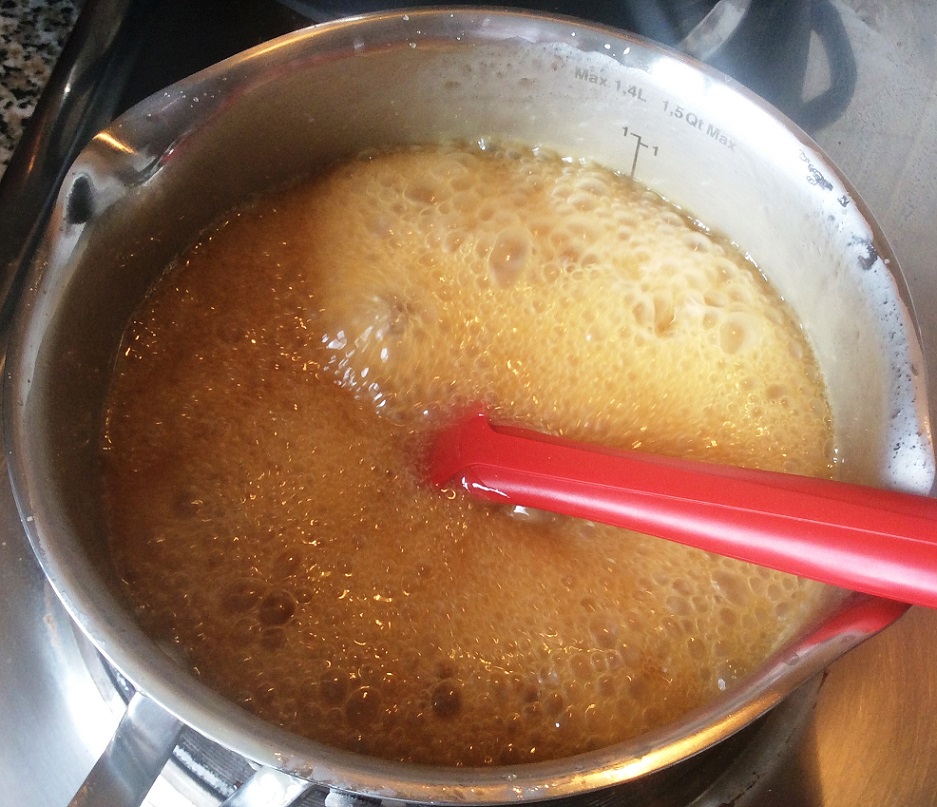 köcheln, rühren - Sobald die Masse zähflüssig ist, den Topf vom Herd nehmen, das Karamell vorsichtig auf die Alufolie gießen und mit einem Teigspatel verstreichen.