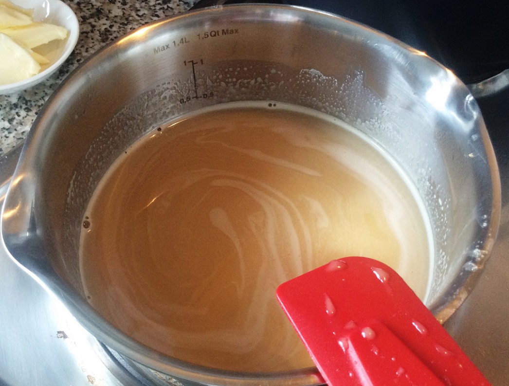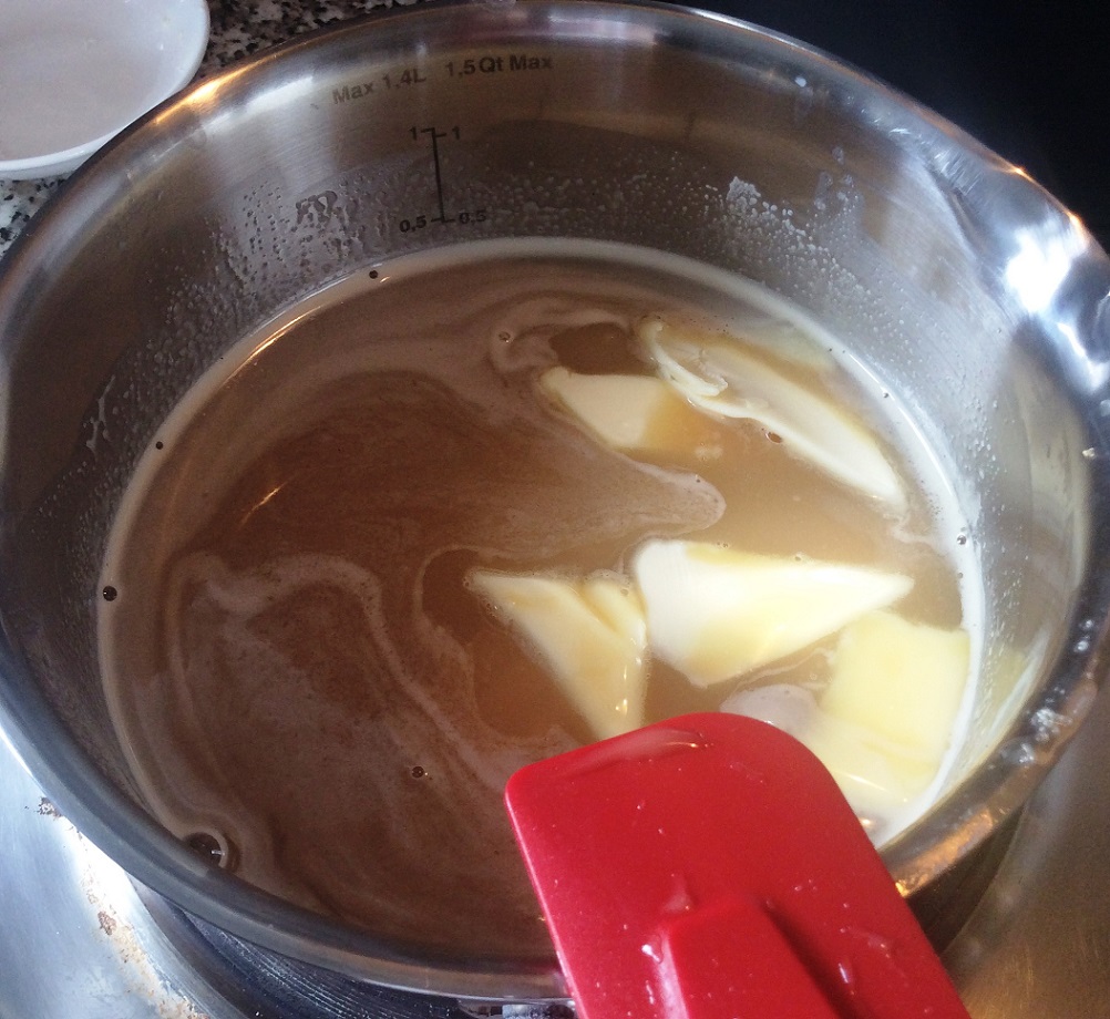 Zucker auflösen - Nun die Butter dazugeben. Alle Zutaten müssen zu einer glatten Masse verschmelzen.