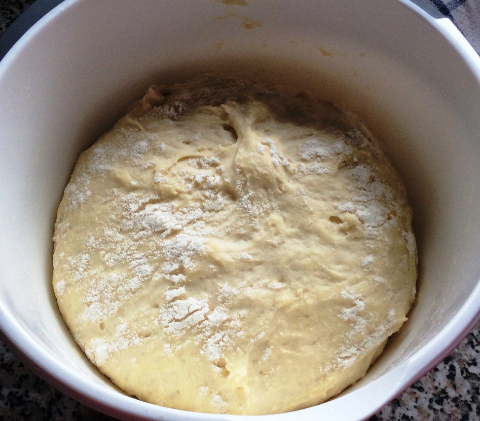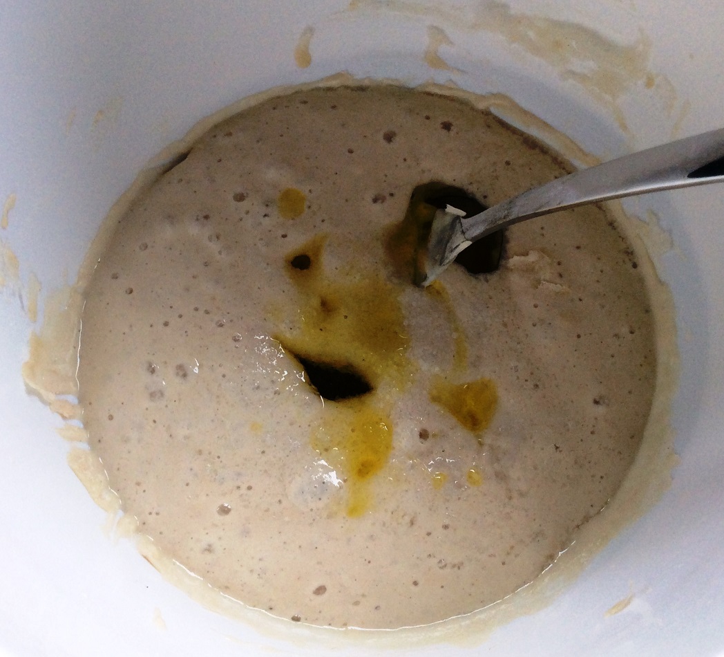 Wasser, Öl und Salz unterrühren Mehl zugeben - Diesen Teil mit etwas Mehl bestäuben, zudecken und nochmals gehen lassen. Der Teig ist so weit, wenn er sein Volumen in etwa verdoppelt hat.