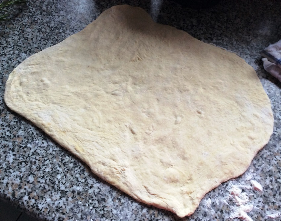 “Diesem handgemachten italienischen Fladenbrot begegnet man überall in Ligurien. Man bekommt es mit Rosmarin, Tomaten, Sardellen oder Oliven und isst es zum Frühstück genauso wie als Zwischenmahlzeit. Die nachfolgende Menge reicht für ein Brot.”