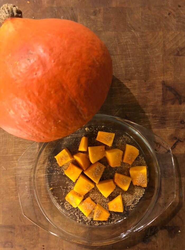 1. Den Kürbis schälen und in Würfel schneiden. Diese mit dem Zucker mischen und in eine feuerfeste Form füllen.