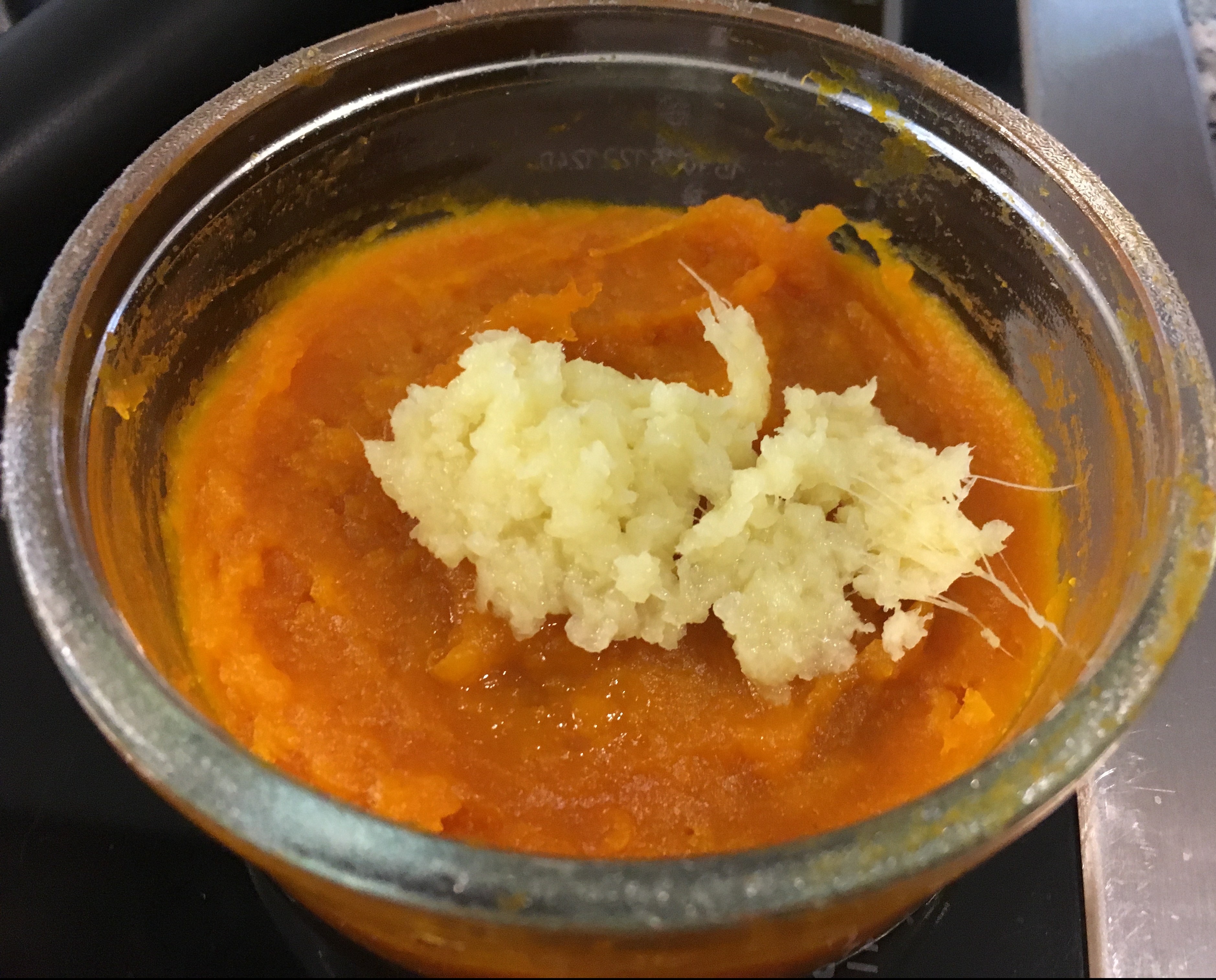 4. Ingwer sehr fein hacken oder direkt reiben und mit dem Zimt zur Kürbismasse, erneut pürieren.