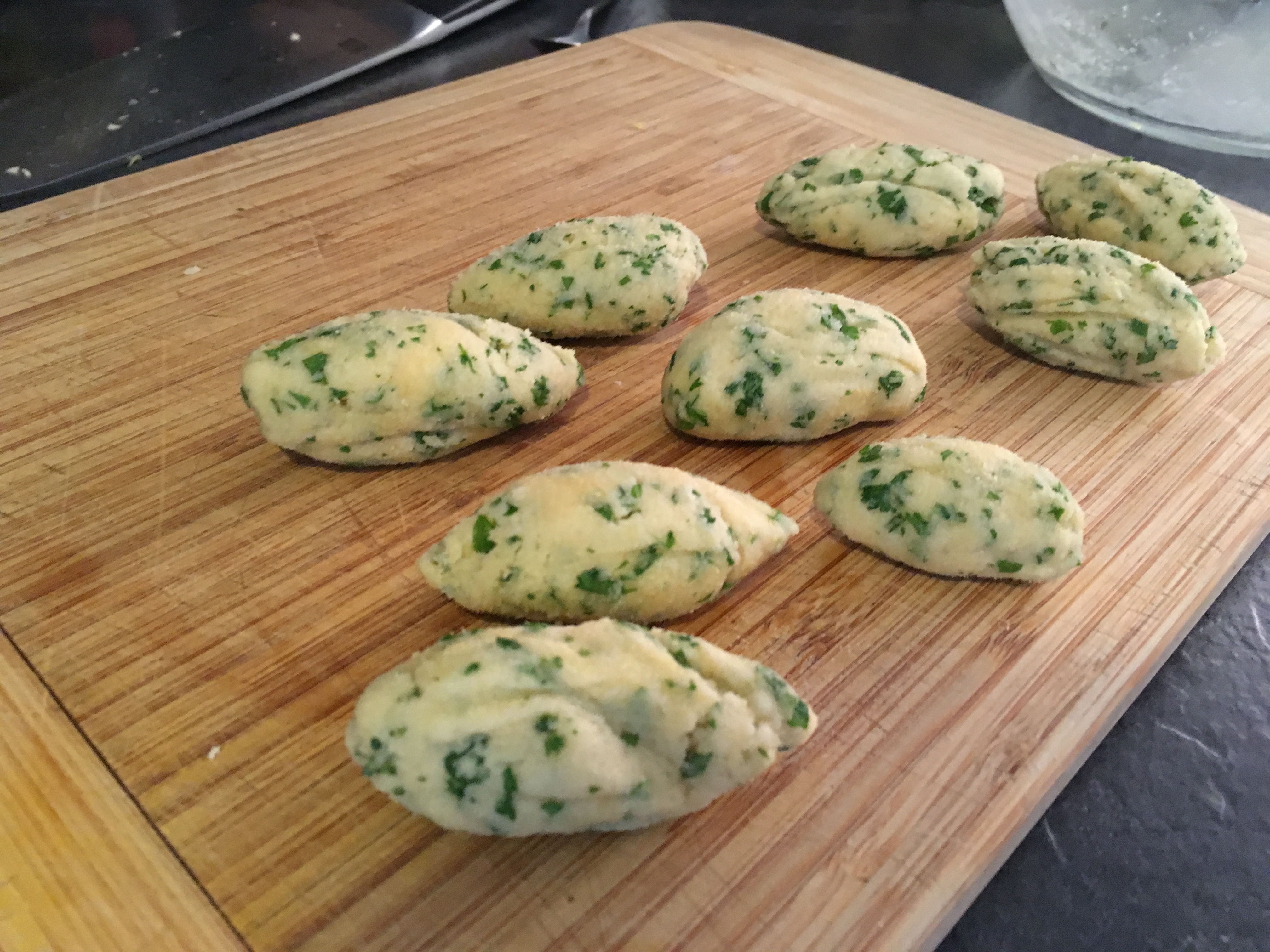 6. Mit einem Esslöffel (nicht zu groß, am besten noch kleiner als meine auf dem Foto) Nocken aus der Teigmasse stechen und in das siedende Wasser legen. Circa 20-25 Minuten ziehen lassen, bis sie gar sind.