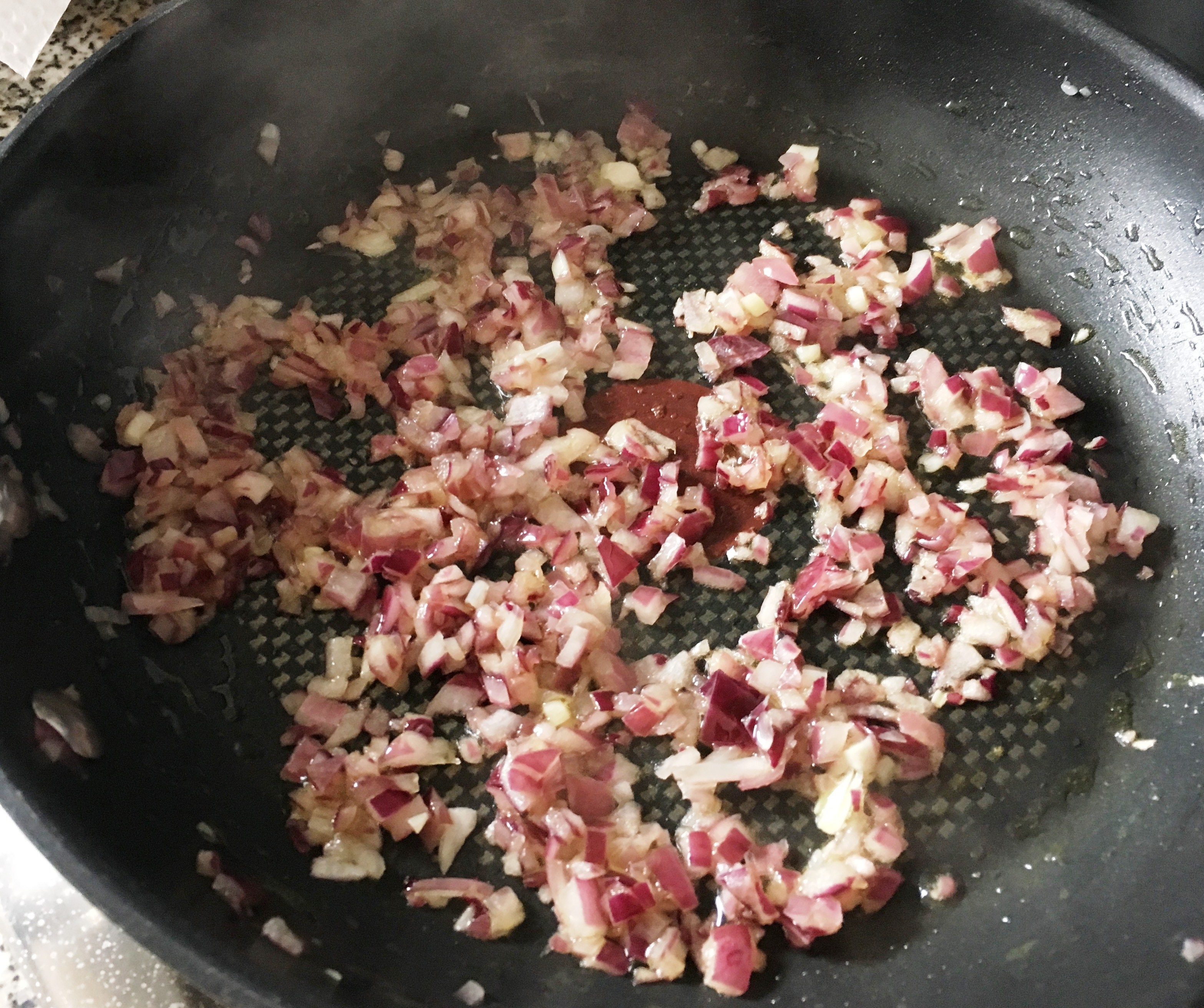 Pinienkerne röstet - Die fein gewürfelte Zwiebel in einer Pfanne mit zwei Esslöffel Olivenöl circa drei Minuten glasig andünsten.