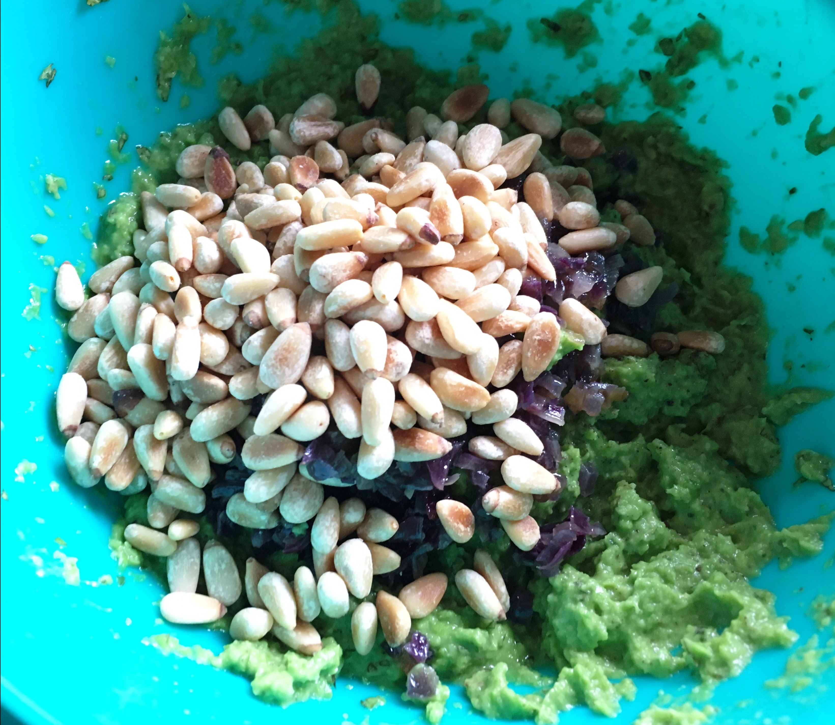 Zwiebeln, Pinienkerne unterheben