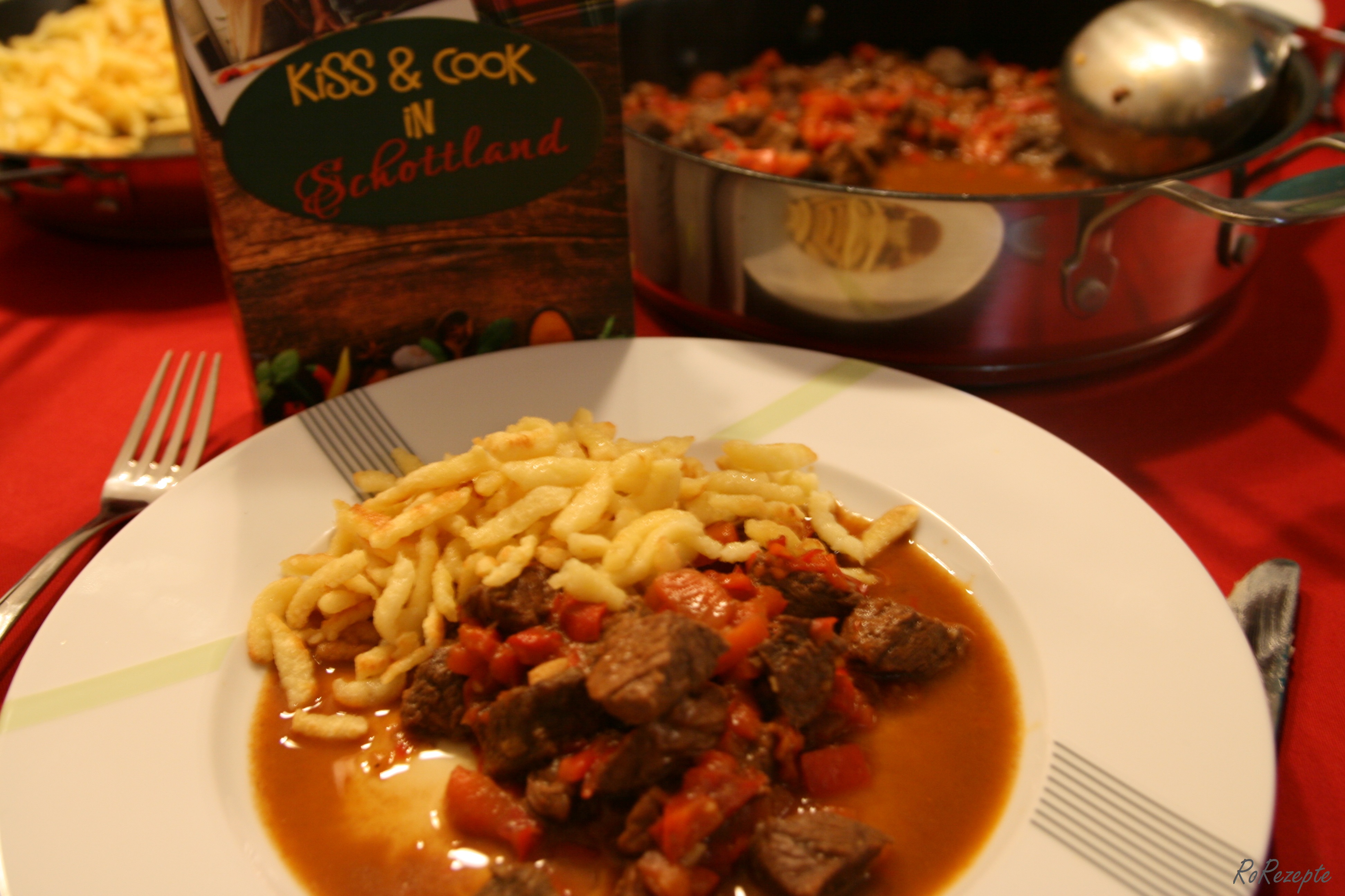 Das Fleisch ist zart und saftig, die Paprika verleiht dem ganzen die nötige Würze. Der Topf voll Gulasch und die Pfanne mit den Spätzle waren ratzeputze alle. Das sagt wohl alles 🙂 Lasst es euch schmecken!