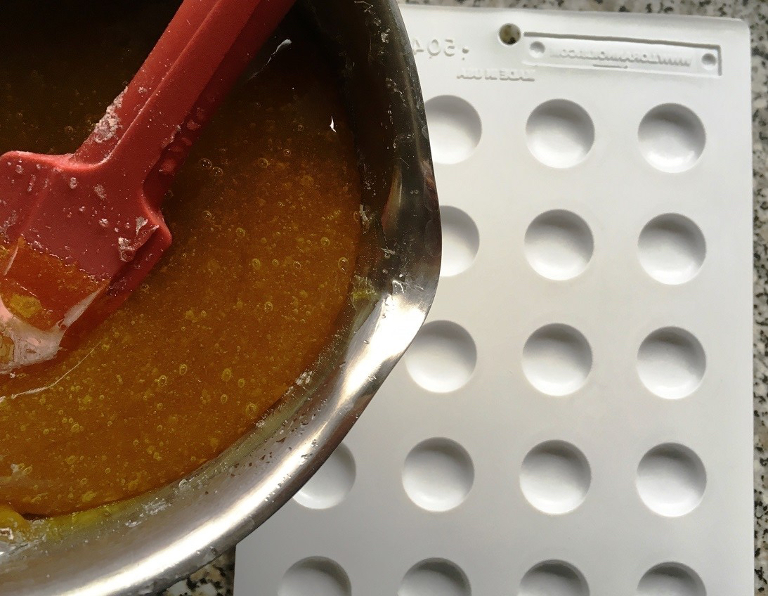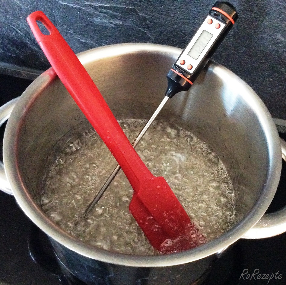1. Grundmasse herstellen und bei Erreichen der Temperatur (exakt 165° und kein Grad wärmer) auf die mit Öl eingepinselte Silikonmatte geben. Da ich dieses Mal keine Bonbons schneiden wollte, habe ich die Masse im Topf gelassen (nicht auf der Herdplatte).