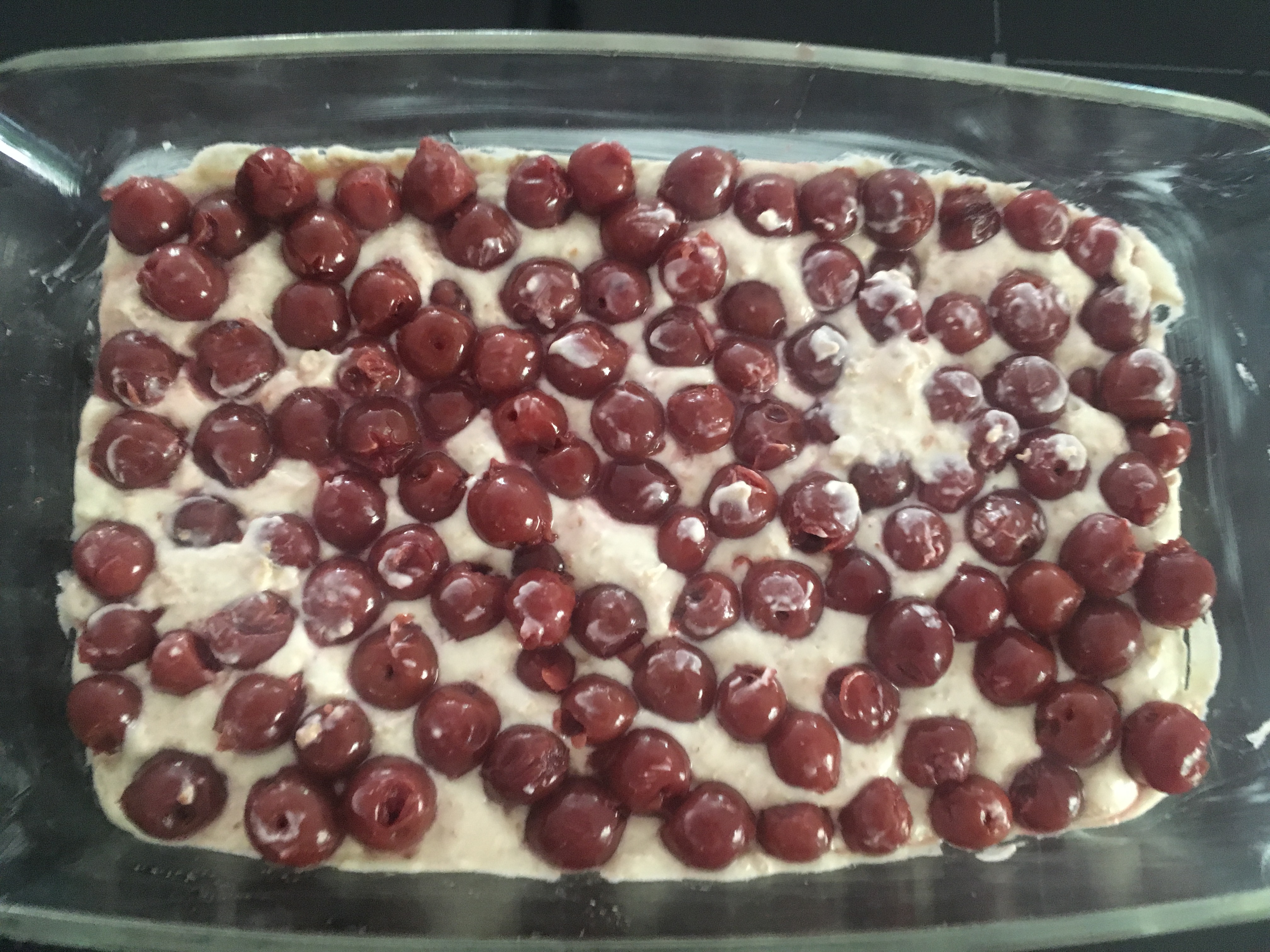5. Die Hälfte der Quarkmasse in eine gut gefettete Auflaufform geben, Kirschen darauf verteilen und den Rest der Quarkmasse darüberstreichen.