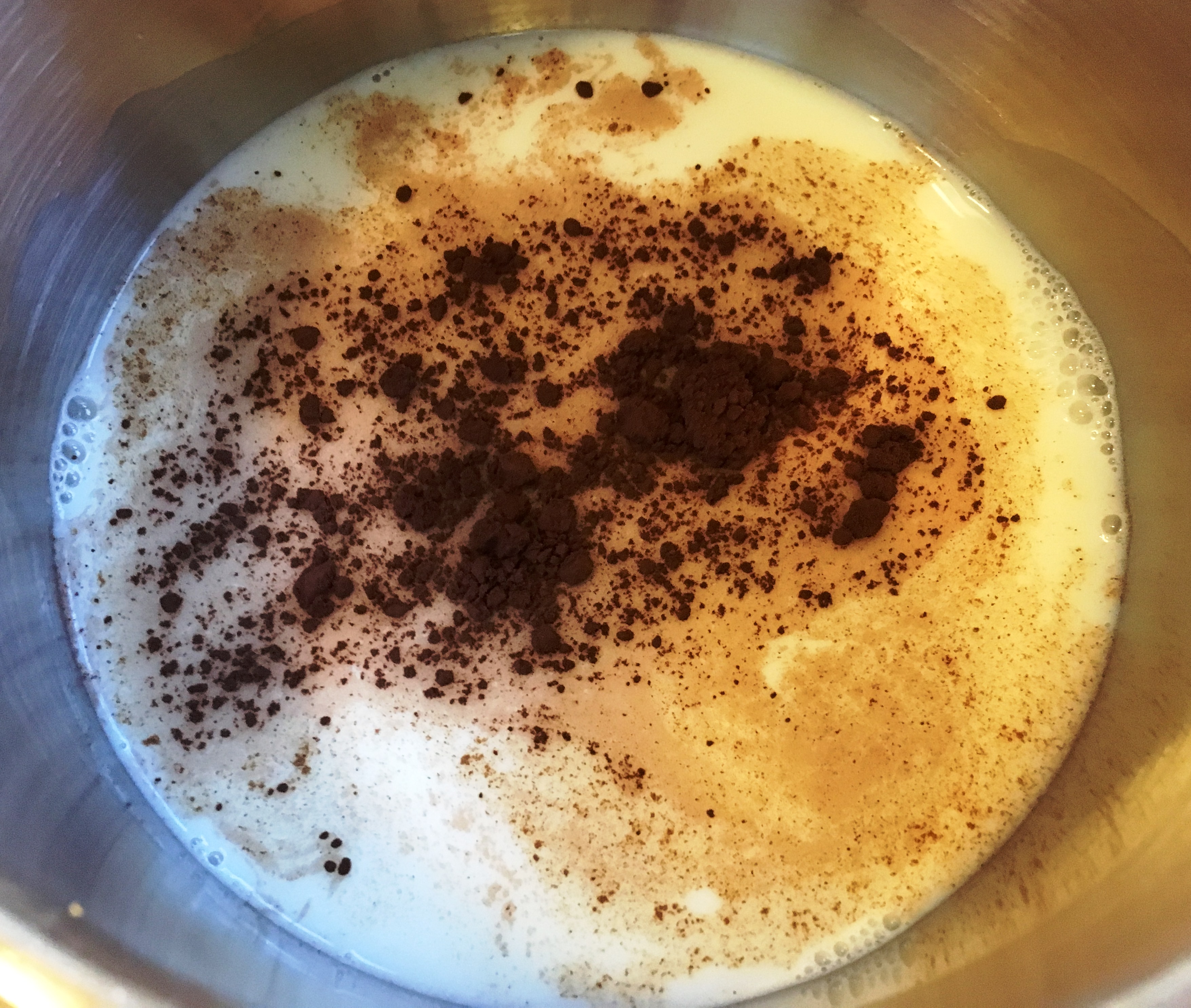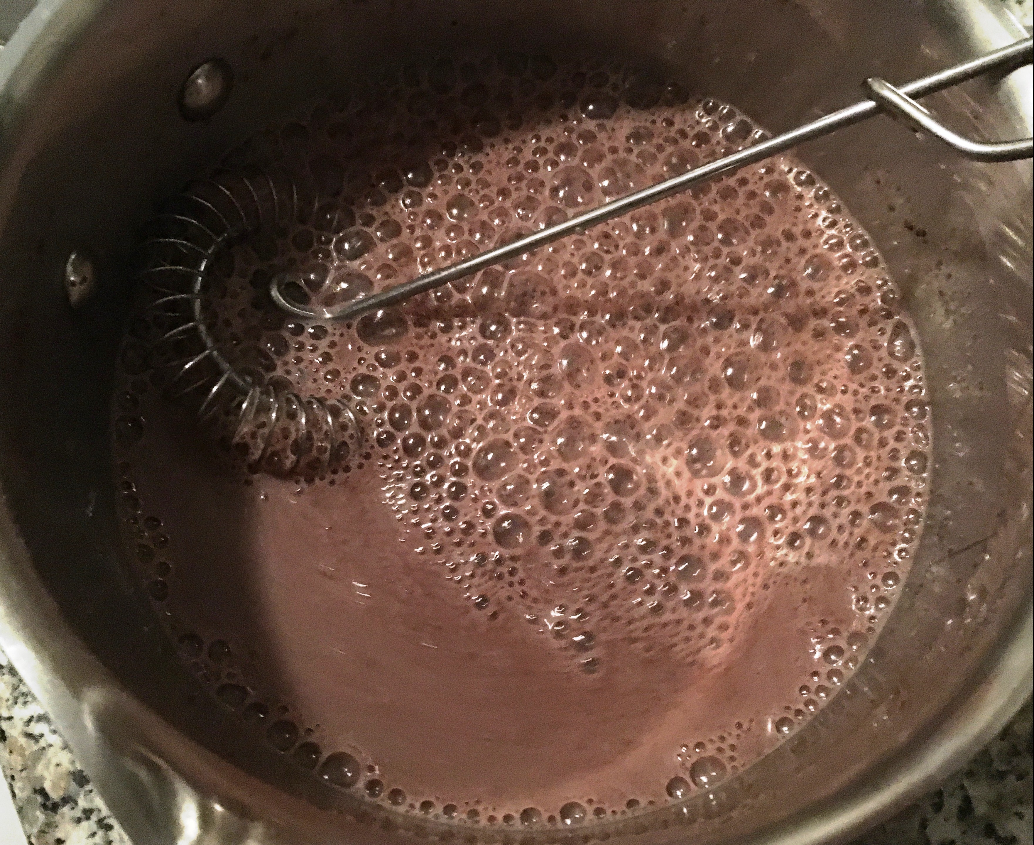 - Alle Zutaten erhitzen und mit einem Schneebesen kräftig (!, sowohl am Anfang, als auch beim Erhitzen, damit sich der Kakao komplett lösen kann) durchrühren: Fertig ist die köstliche Gewürzschokolade! Perfekt zum Einkuscheln an kalten Wintertagen.