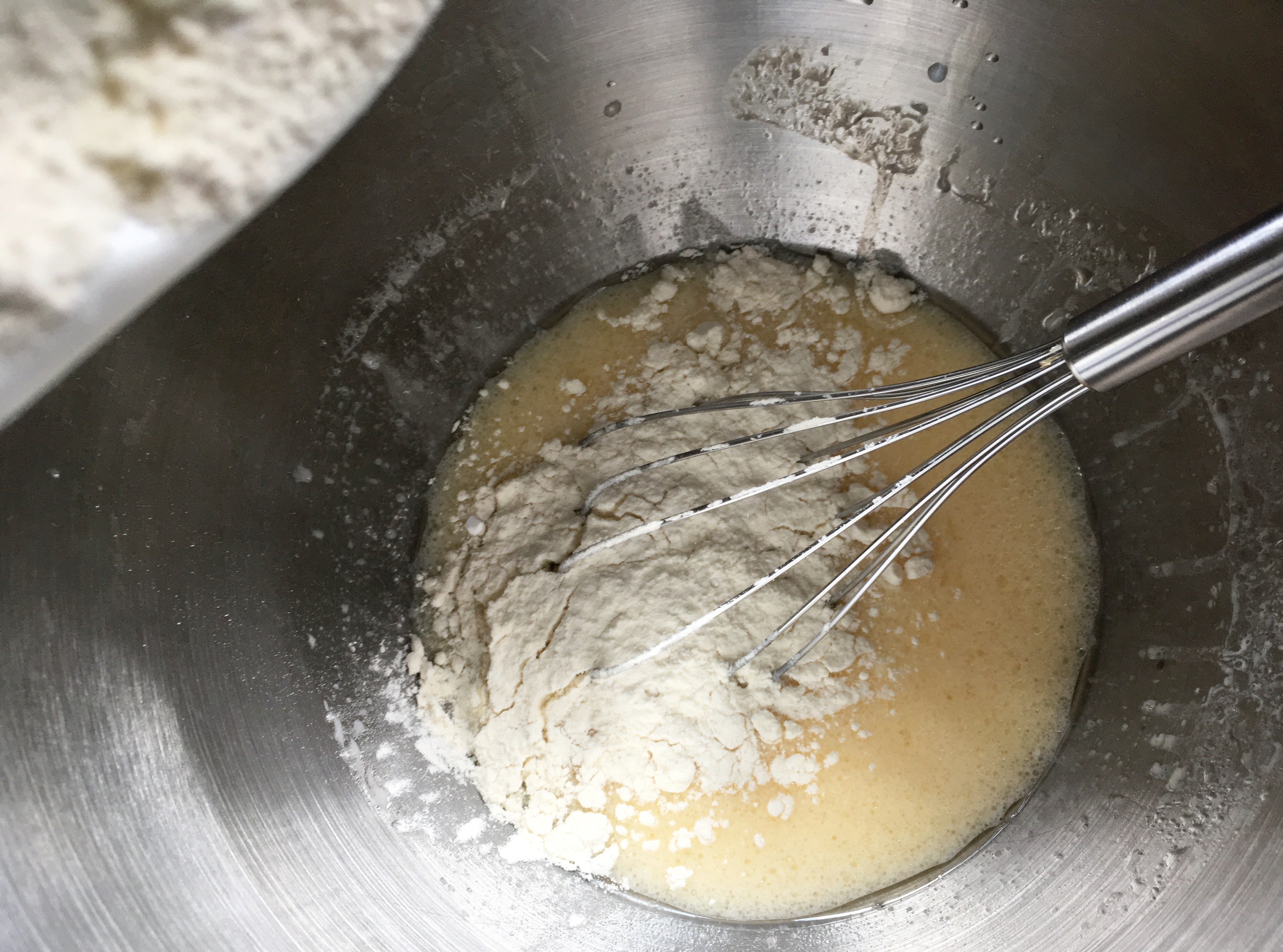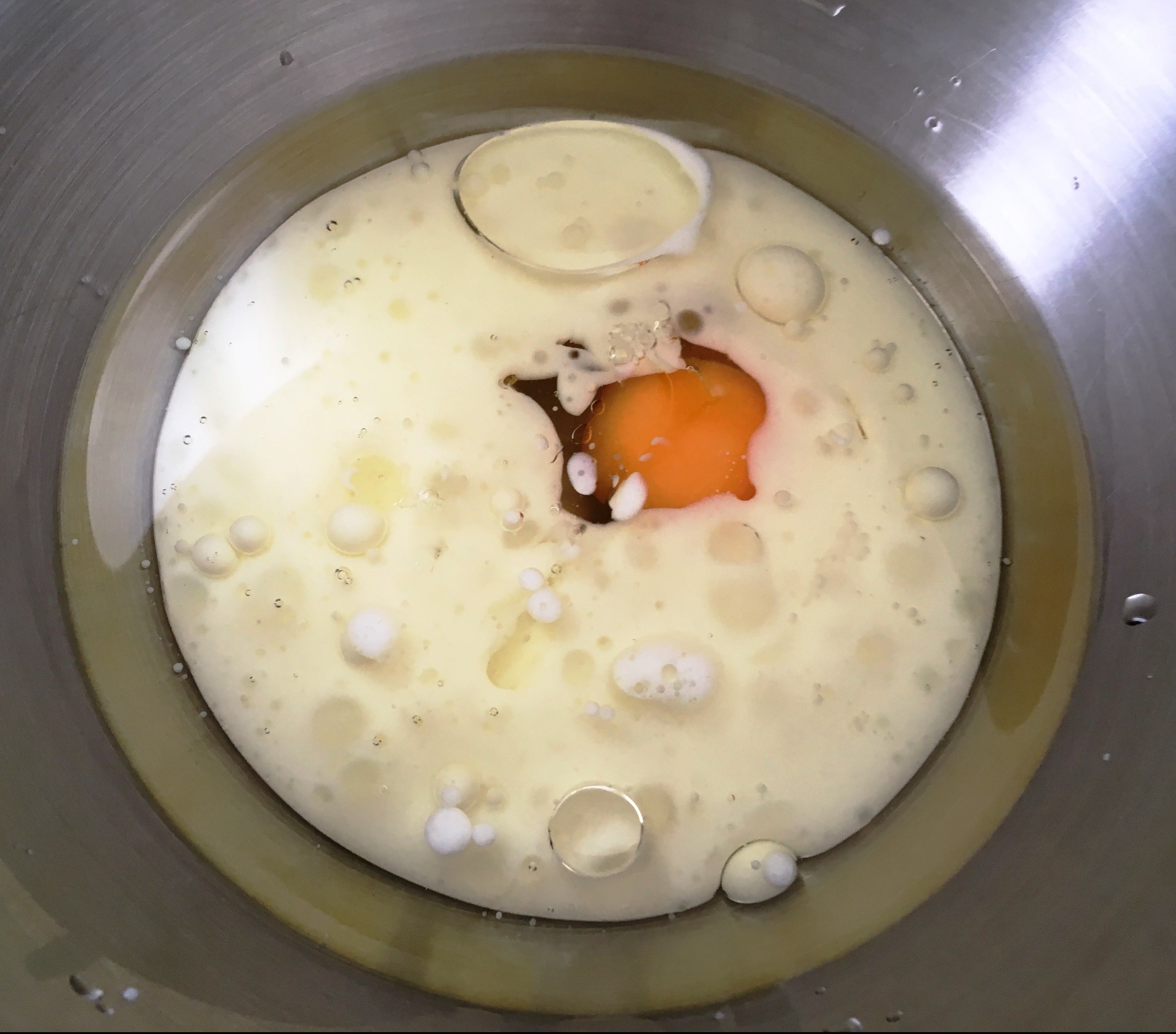 Mehl, Backpulver - Ei, Öl und Buttermilch vermischen, Zucker zugeben und das Mehl langsam unterheben