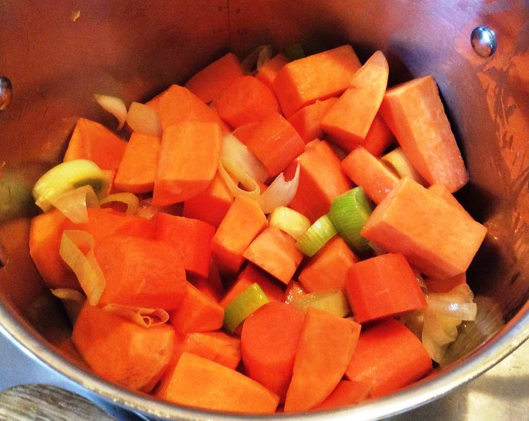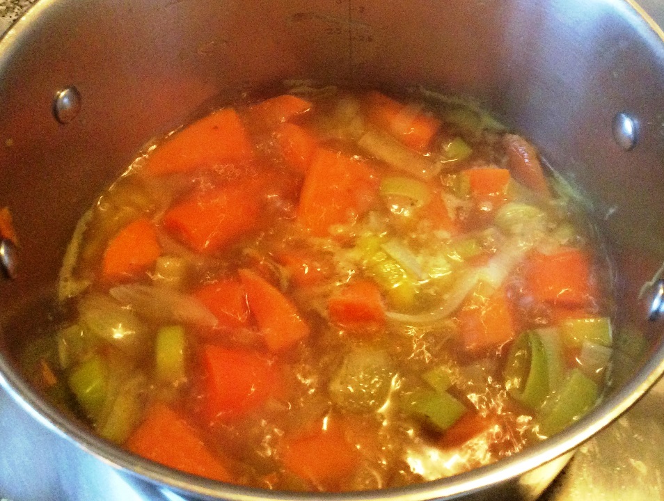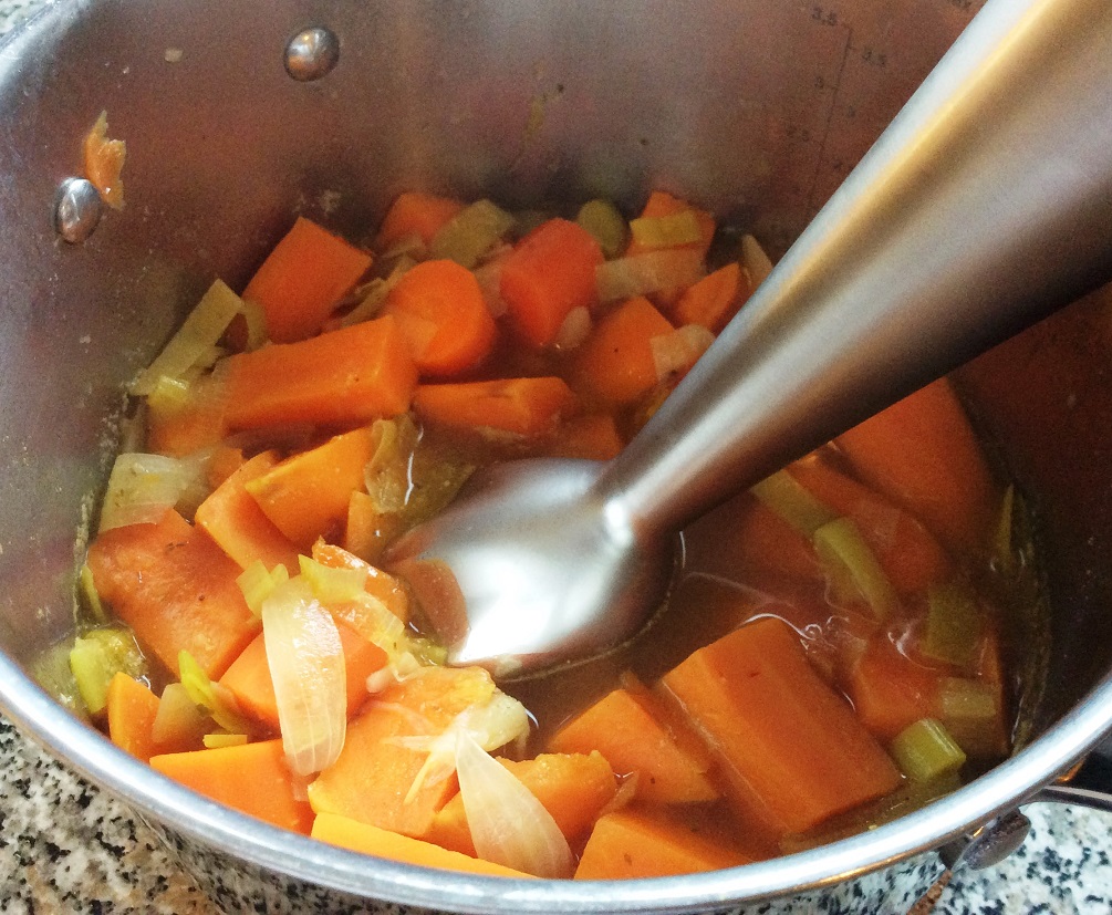 Brühe auffüllen - Prüfen, ob das Gemüse (insbesondere die Süßkartoffeln) weich sind. Wenn ja, mit dem Pürierstab pürieren. Die Konsistenz kann hier noch einmal mit etwas Gemüsebrühe angepasst werden (leider nur noch hin zu „flüssiger“).