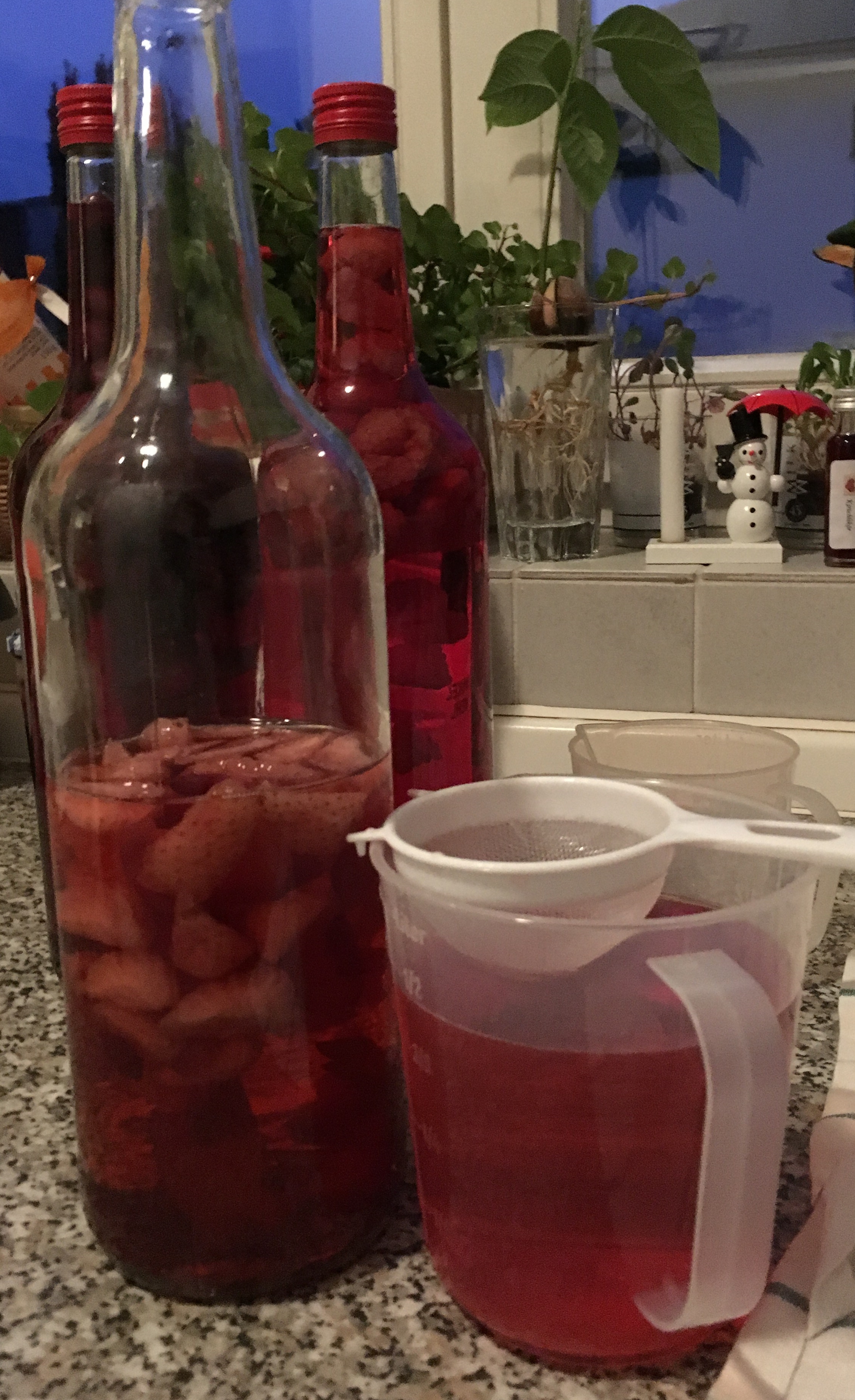 - Nach der Ruhezeit den Ansatz filtern: entweder den Likör durch einen mit einer Filtertüte ausgelegten Trichter oder ein sehr feines Sieb gießen. Anschließend den Likör in mit kochend heißem Wasser ausgespülten Flaschen füllen und gut verschließen.