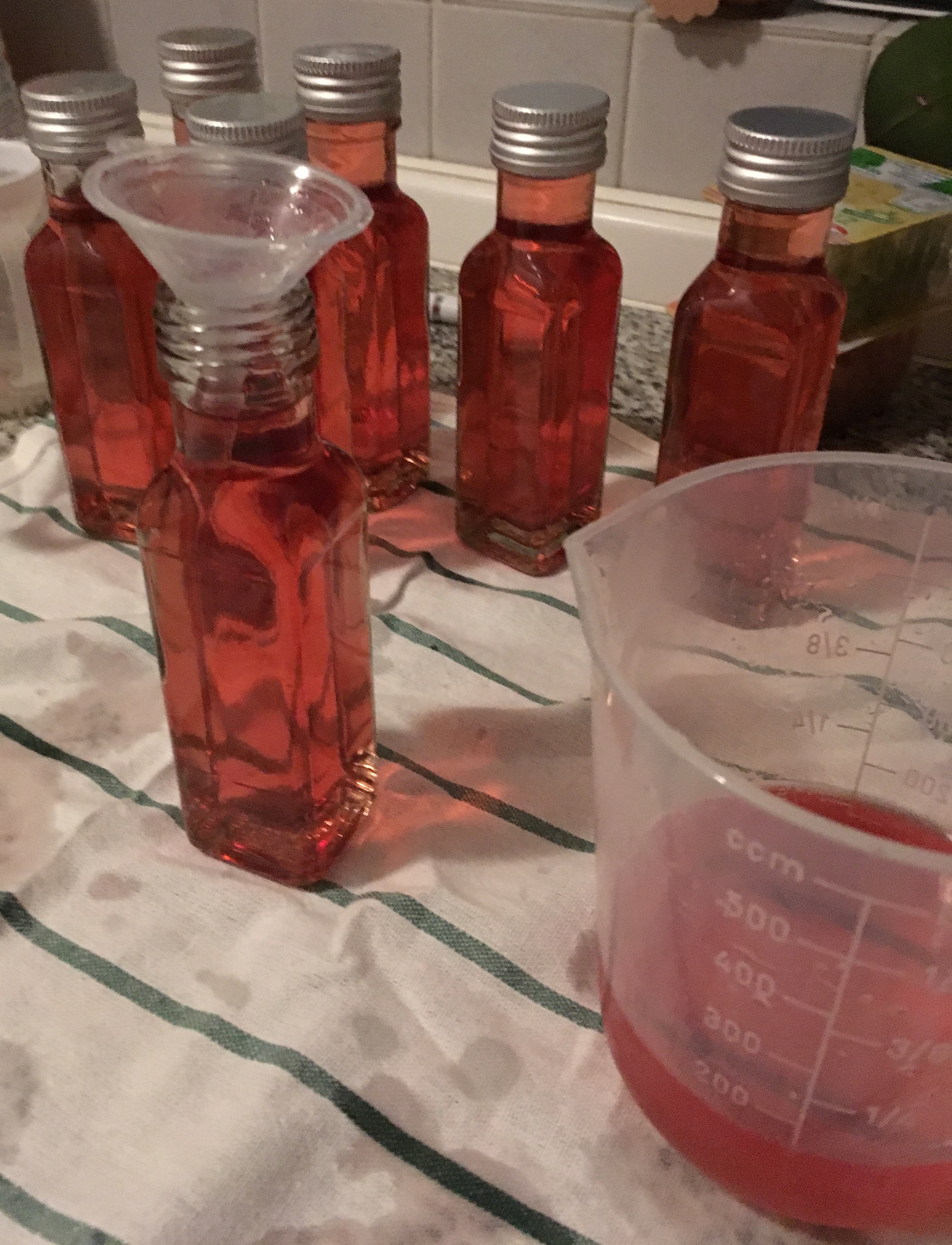 Trichter zum Füllen Rum füllen - und mit dem klaren Schnaps (Korn) aufgießen.