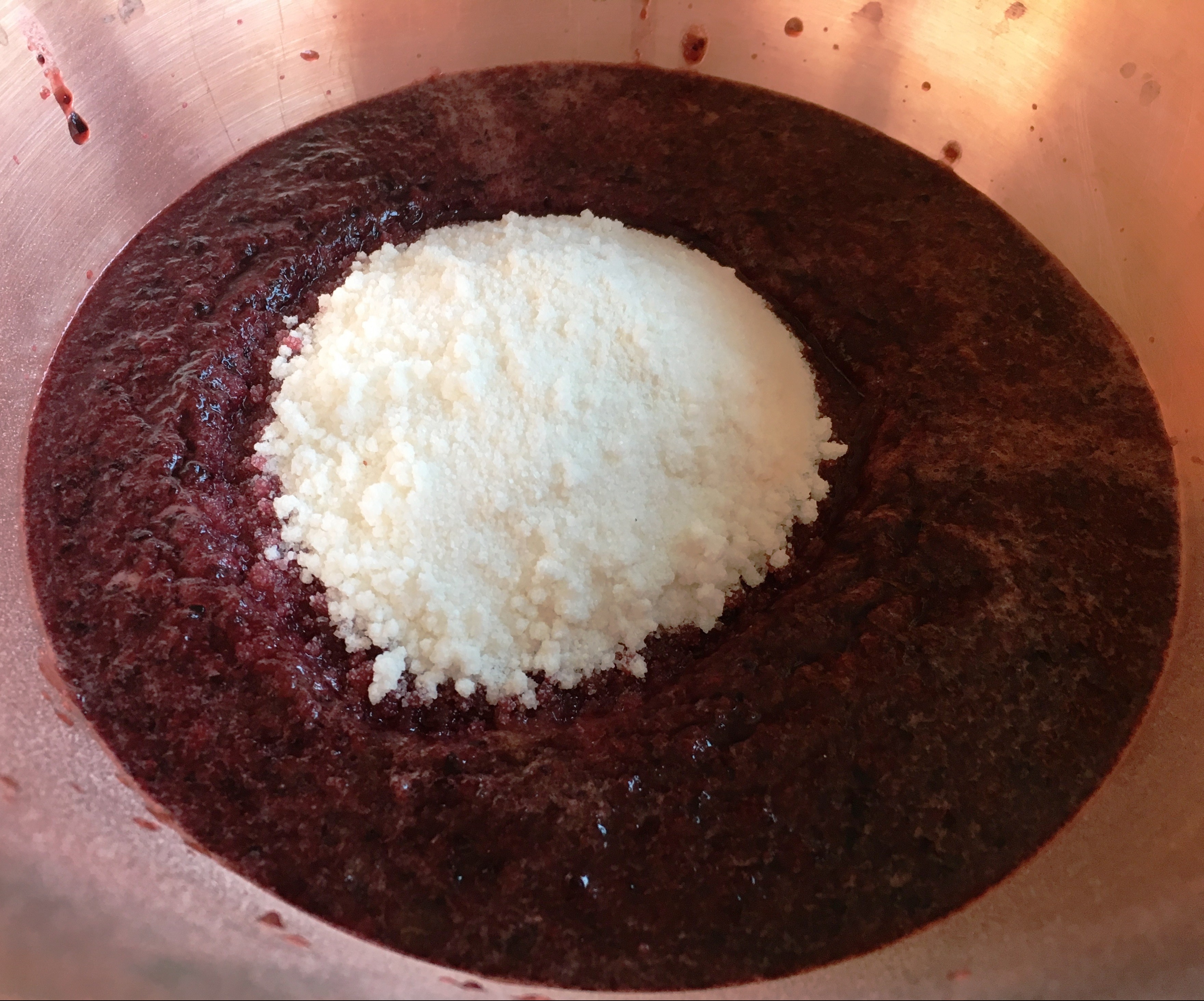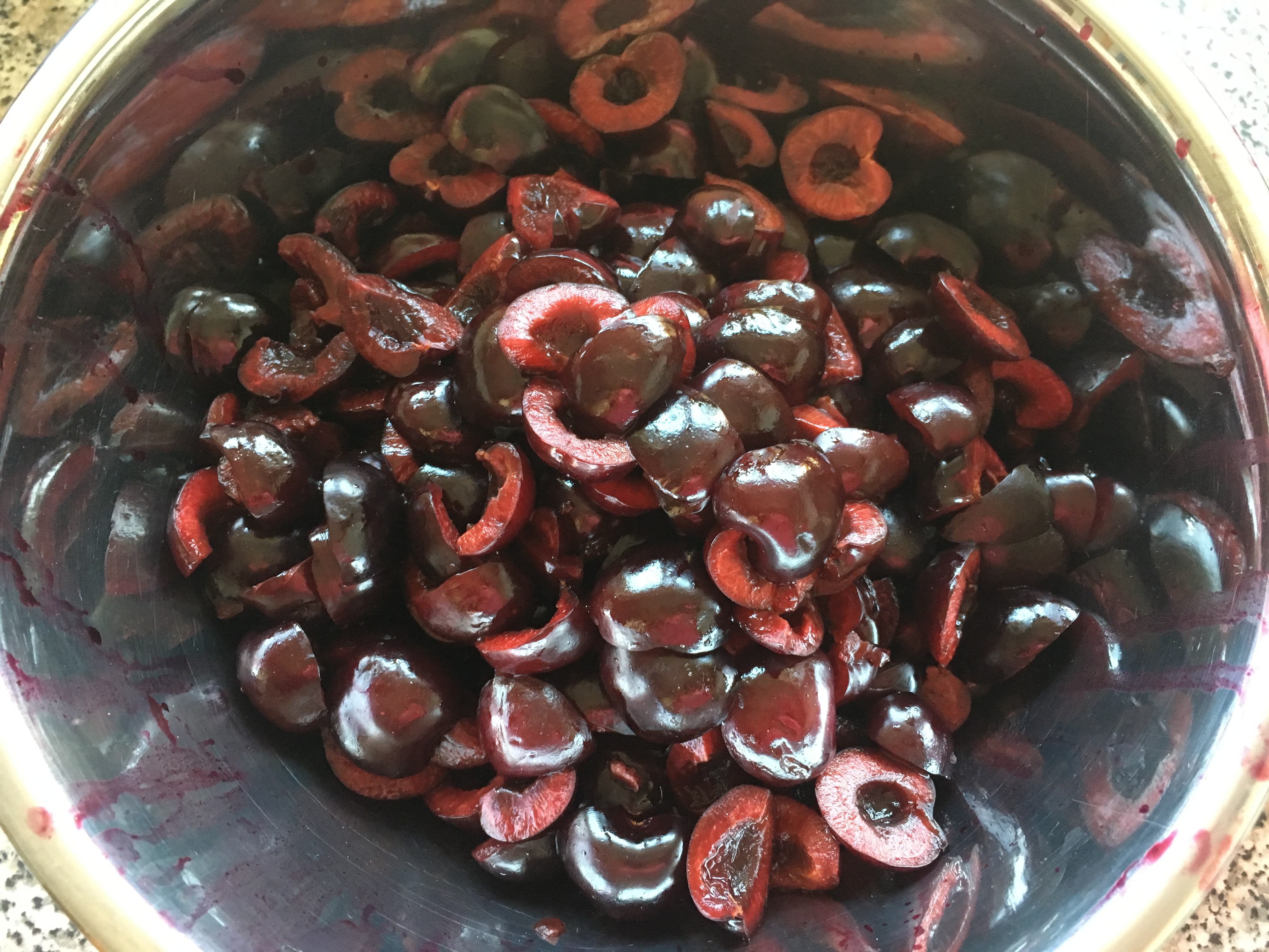 - Die Kirschen waschen und entsteinen, danach nochmal wiegen: es müsste jetzt 1 kg sein.