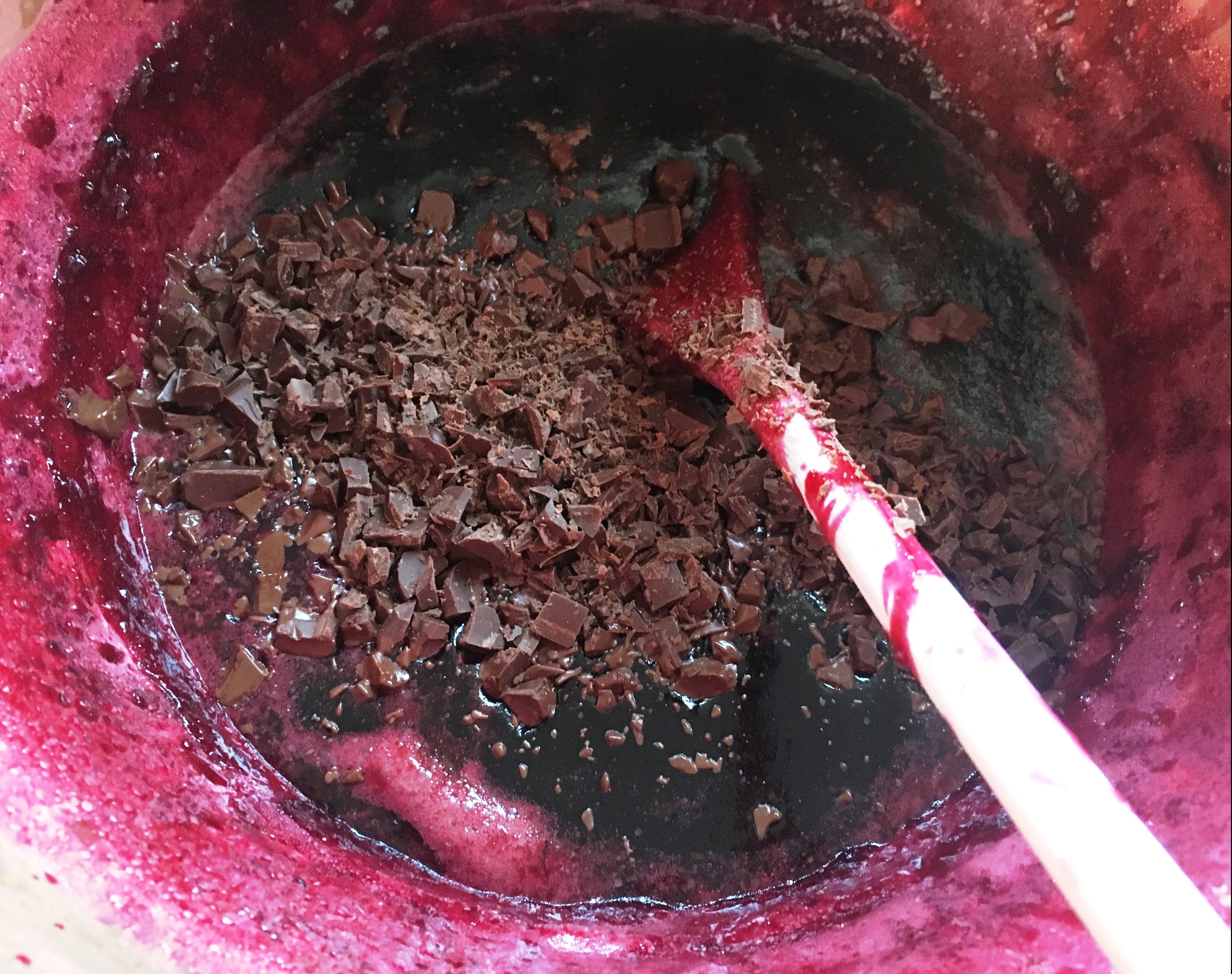 abfüllen - Variante: Schokolade erst zur Marmelade geben, wenn die schon etwas abgekühlt hat, dann löst sie sich nicht vollständig auf.