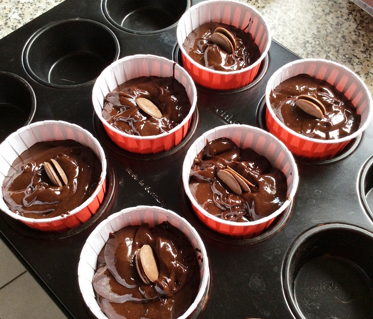 in Muffinform gießen, Schokostücke reingeben schließen, backen - Auf der mittleren Schiene in den Ofen schieben, circa 15 Minuten backen und mit einer Stäbchenprobe testen, ob der Teig schon gar ist. Sollte eure Muffinförmchen so groß sein, dass diese nicht den Boden im Muffinblech berühren, so backt diese ohne das Muffinblech. Die Backhitze muss von allen Seiten gleich an euer Soufflee kommen.