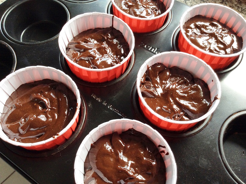 geschmolzene Schokolade zugeben Teig - Den Teig in sechs Muffinformen füllen. Wer einen flüssigen Schokoladenkern möchte, drückt jeweils ein Stück Schokolade in den Teig. Sollten eure Förmchen ebenfalls größer sein, so würde ich (nicht wie ich) alles auf 5 Formen verteilen.