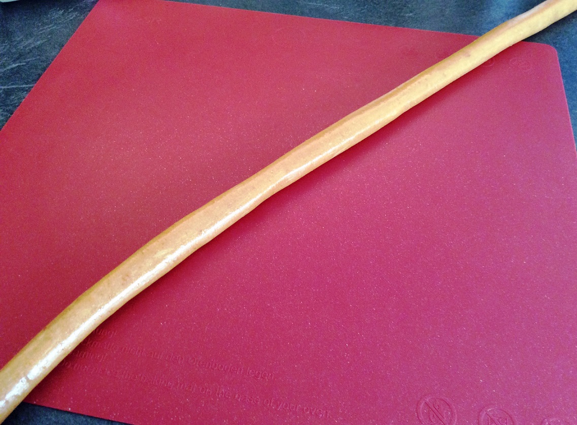 rollen und umhüllen Bonbonstange - Erst nach dem Trocknen mithilfe von Morfas Allesschneider oder über der Kante eines alten Schneidebretts mit einem Messer in kleine Stücke zerschlagen. Oder für die einfache Hausfrau – Bonbonstange auf das Holzbrett legen, mit einem guten scharfen Messer Ring um Ring abhacken. Lasst die Stange nicht allzu lange abkühlen, dann hilft evt. die Hausfrauentechnik nicht mehr 🙂