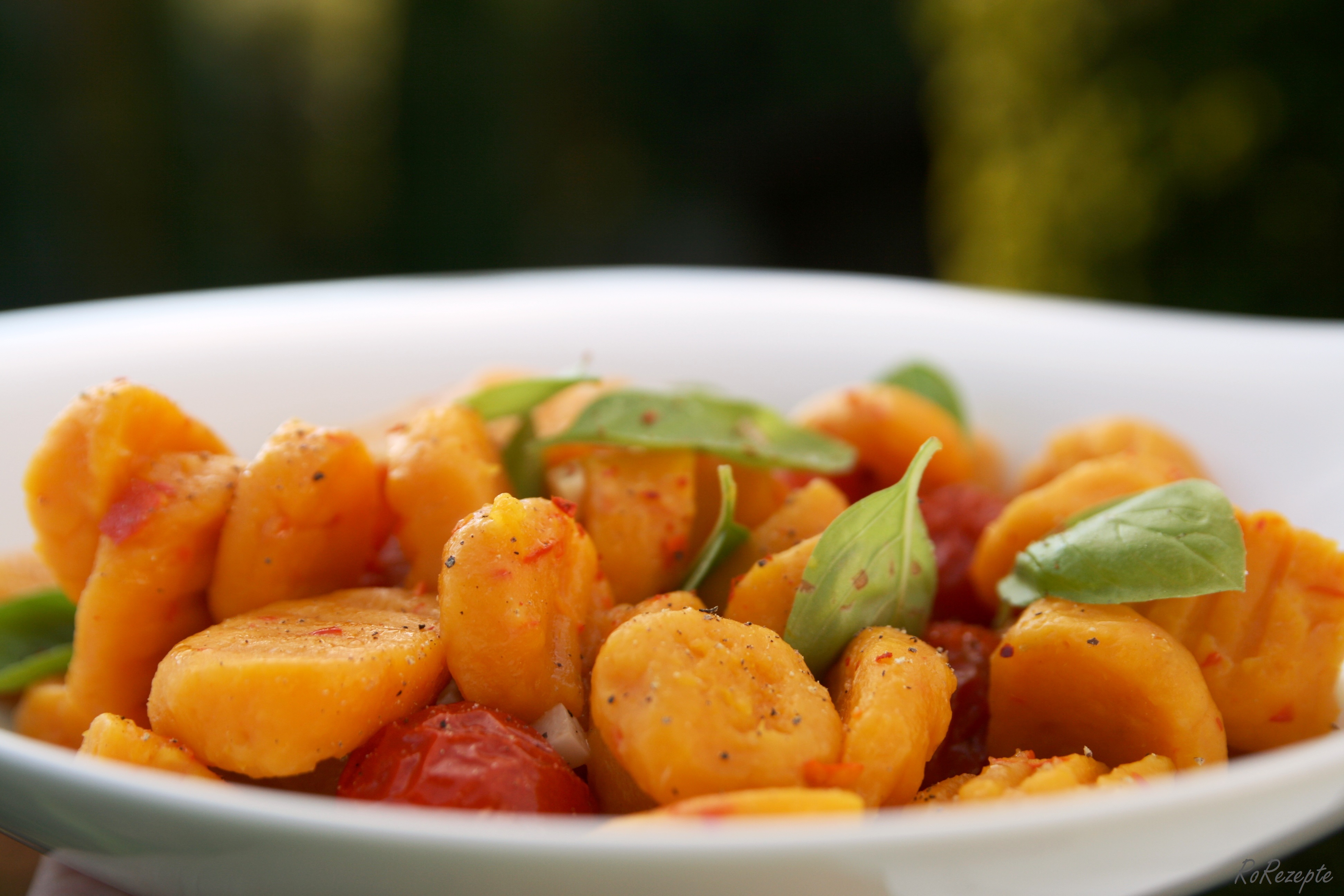 Tomaten gebacken - Die Gnocchi mit den geschmolzenen Tomaten und dem Basilikum mischen. Etwas Salz und frisch gemahlenen Pfeffer darüber geben und genießen.