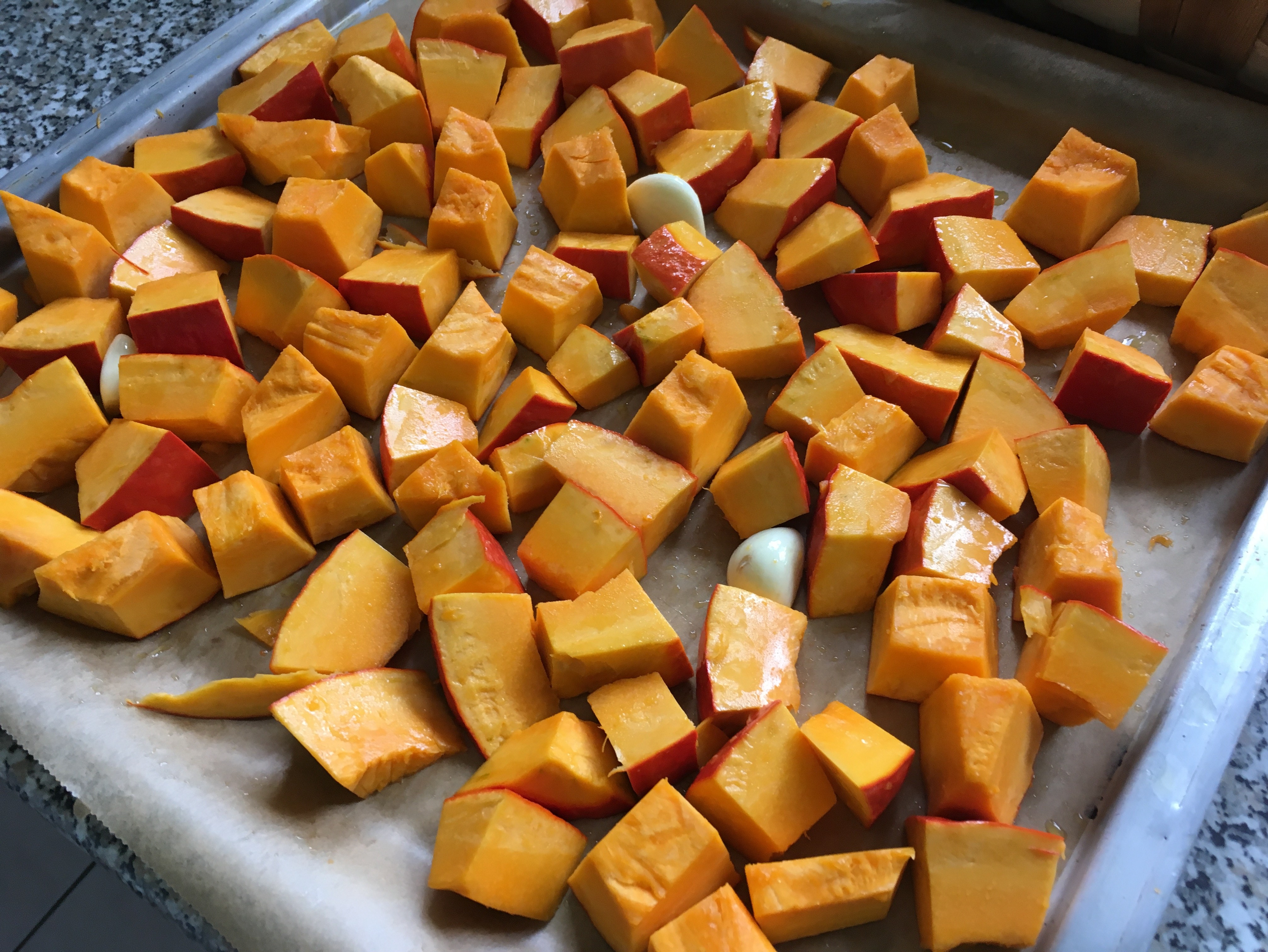Kürbis würfeln, ölen, Knoblauch zugeben und in den Backofen schieben - Abkühlen lassen und in eine Schüssel geben.