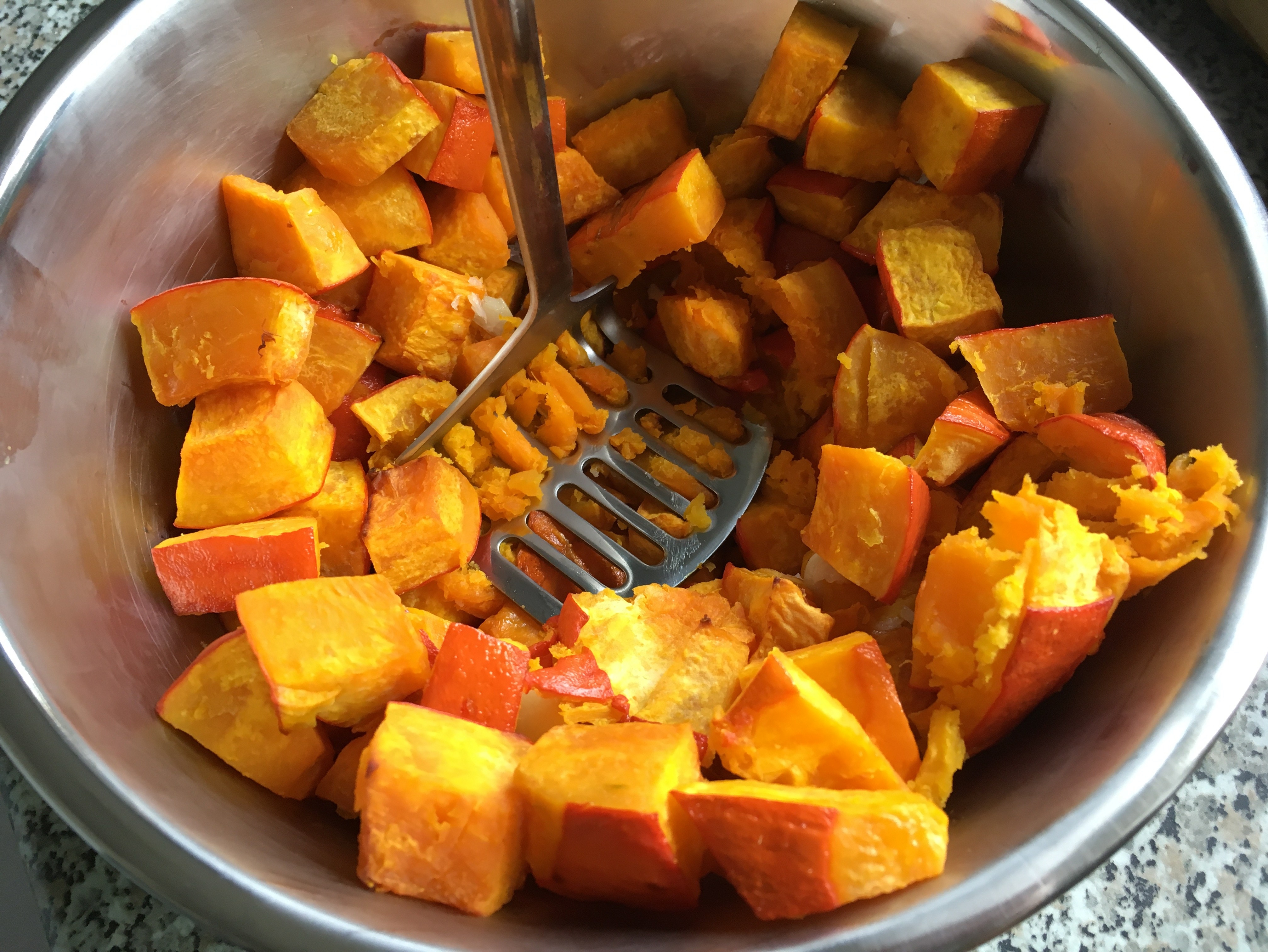 - Den Kürbis und den Knoblauch mit einer Gabel zerdrücken. Mein Kürbis war beim Backen eher trocken und nicht wie bei der Autorin eher feucht geworden.