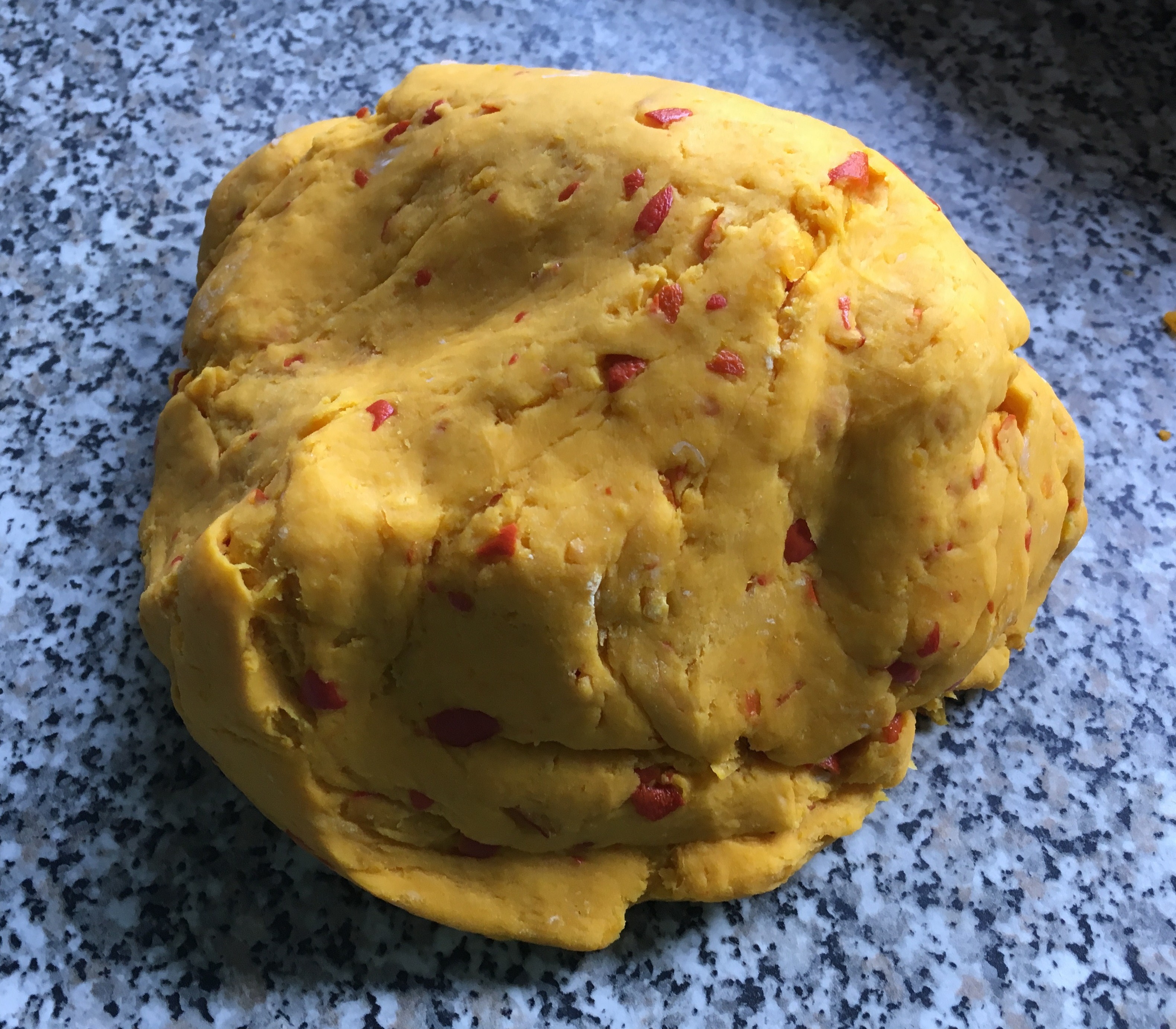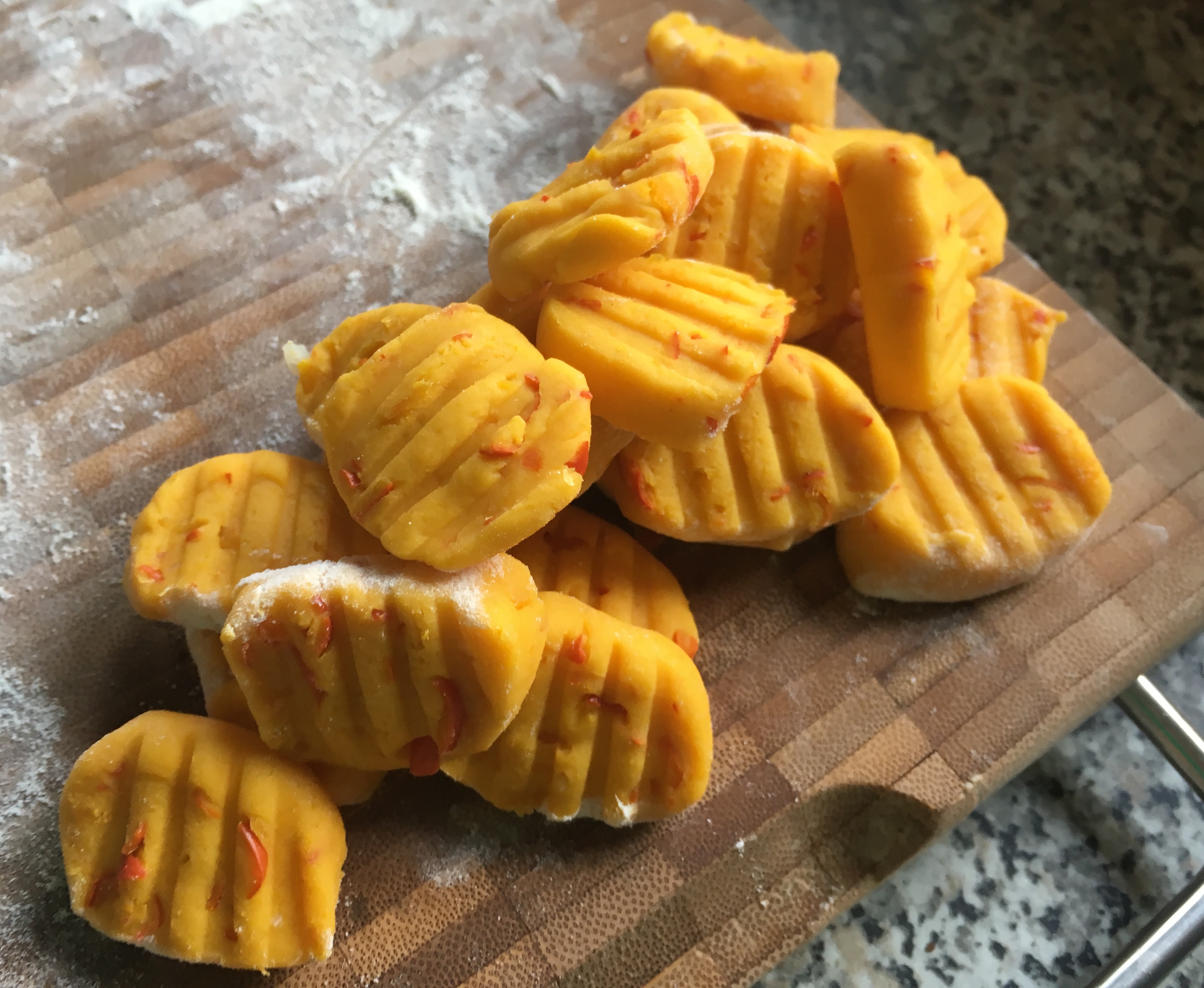 Mehl untermengen - Jetzt ist etwas Fingerspitzengefühl gefragt. Der Teig sollte nicht mehr kleben, aber noch weich sein. Trotz dass ich 50% mehr Kürbis hatte, brauchte ich für meinen Teig fast nur die Hälfte des Mehls.