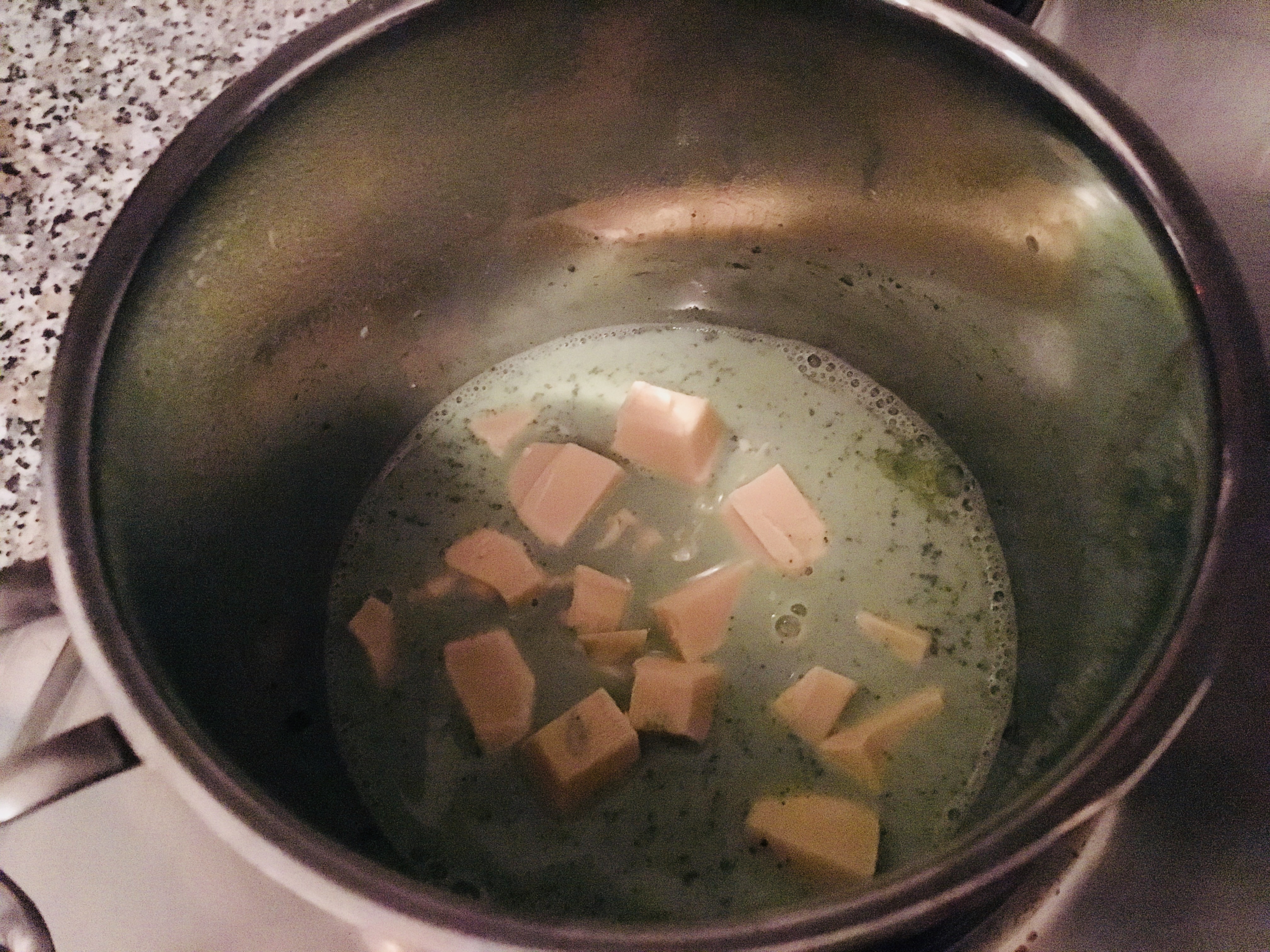 Milch erwärmen Matcha Pulver zugeben - Die klein gehackte Kuvertüre langsam hinzugeben und schmelzen.