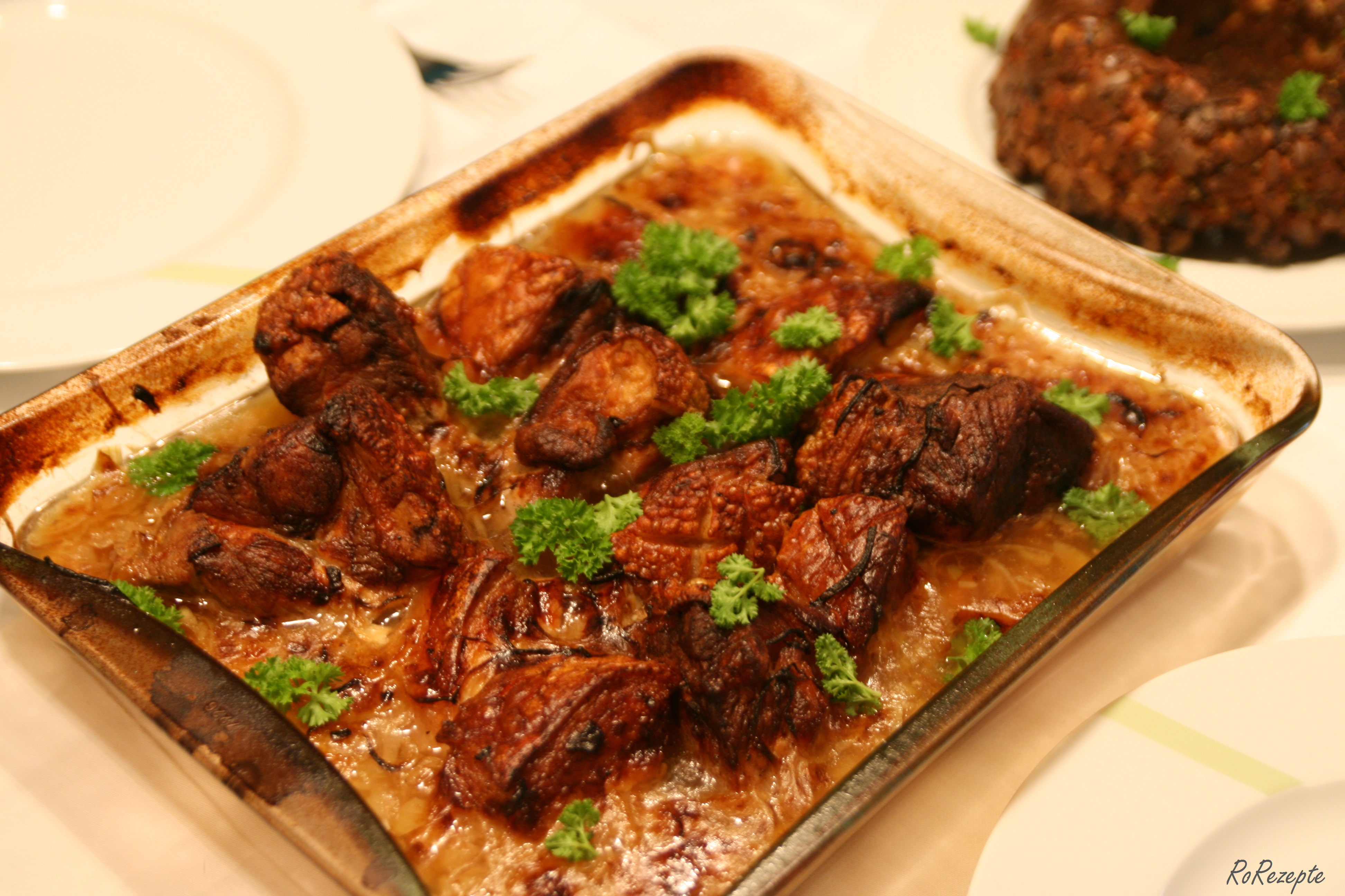 Anbraten Anbraten in Reine gesammelt Ofen schmoren - In der Pfanne, in der das Fleisch angebraten wurde, die klein geschnittenen Zwiebeln geben und scharf anbraten. Lt. Buch “in feine halbierte Ringe” Den Knoblauch gibt man erst etwas später zu den Zwiebeln, da er sonst bitter wird.