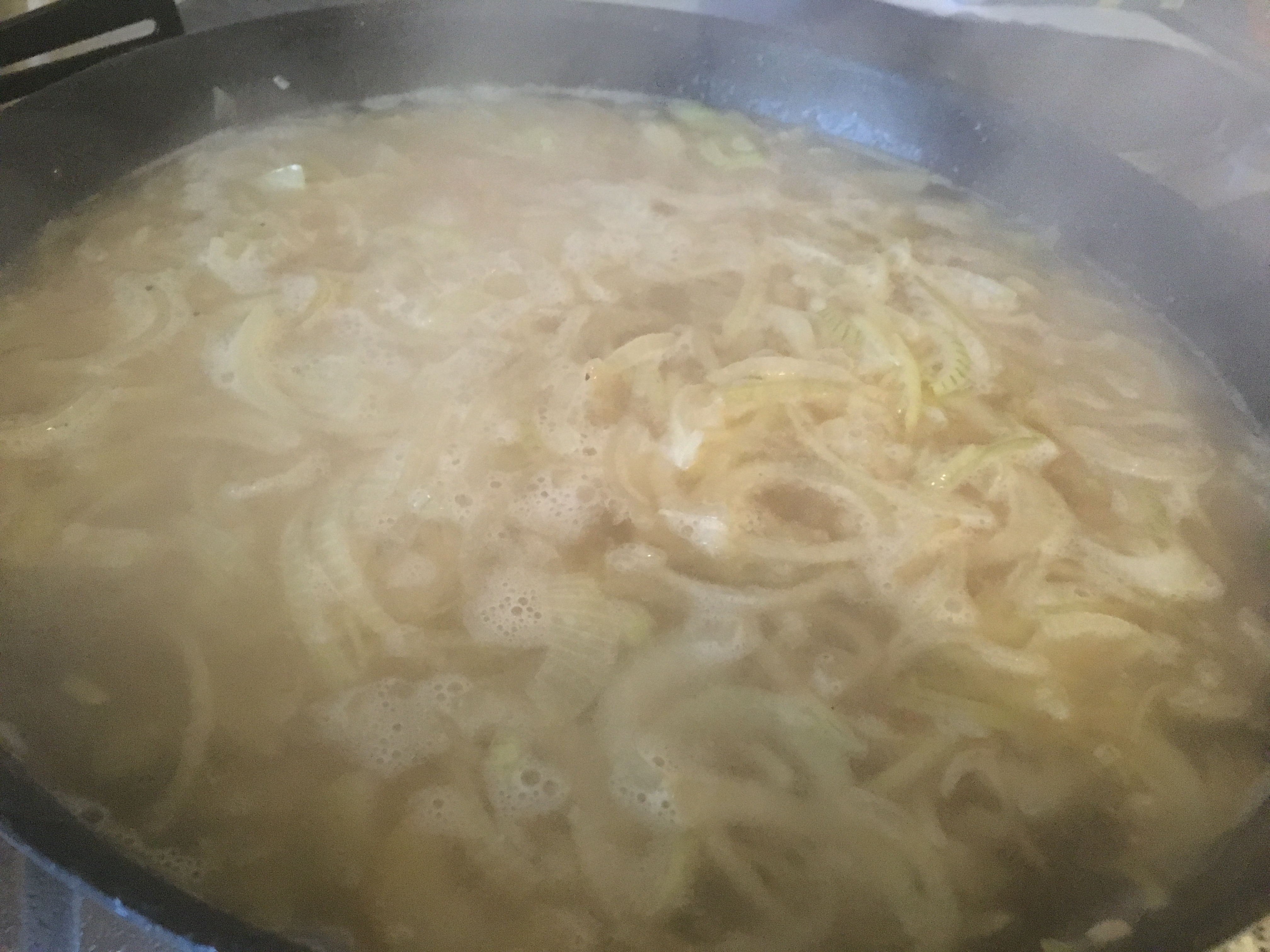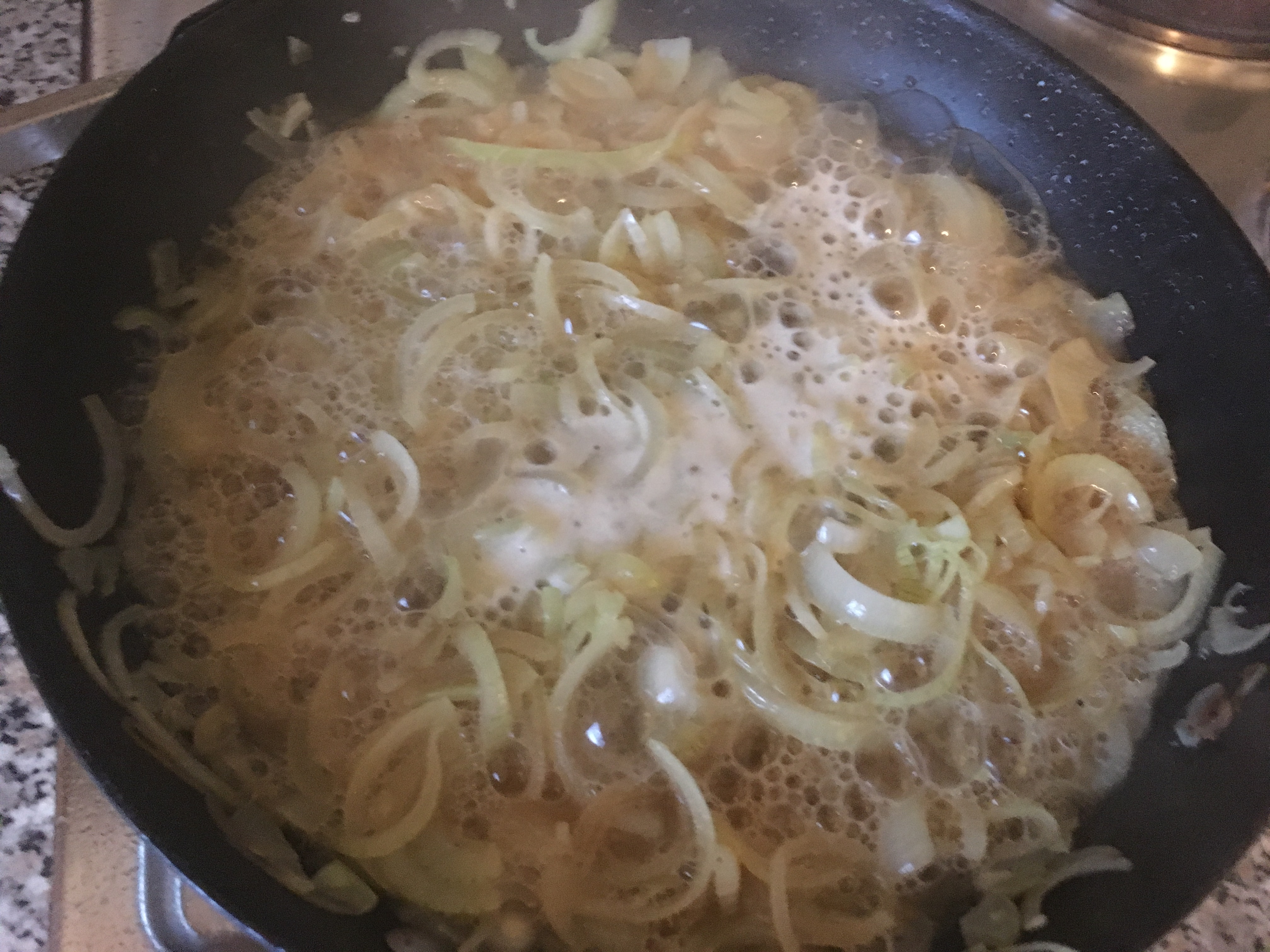 Zwiebeln schneiden Zwiebeln anbraten Zwiebeln angebraten - Die Zwiebeln mit der halben Flasche Weißbier aufgießen, mit Salz und Pfeffer würzen und danach mit kochendem Wasser aufgießen.
