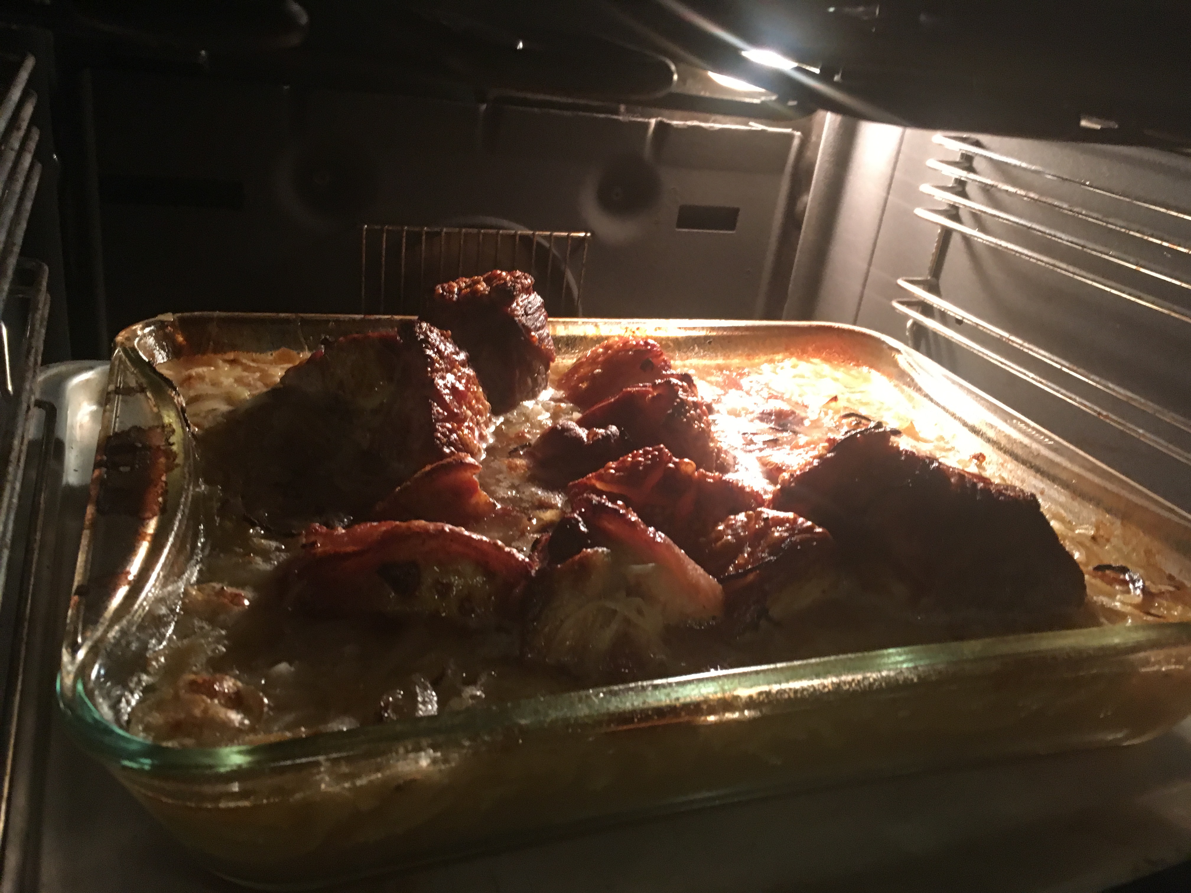 Salzwasser für die Kruste - Nach etwa einer halben Stunde noch mal wiederholen und restliches Bier in die Soße geben. Falls nötig, Soße noch mit etwas zusätzlichem Wasser aufgießen. Bei mir war kein zusätzliches Wasser nötig.