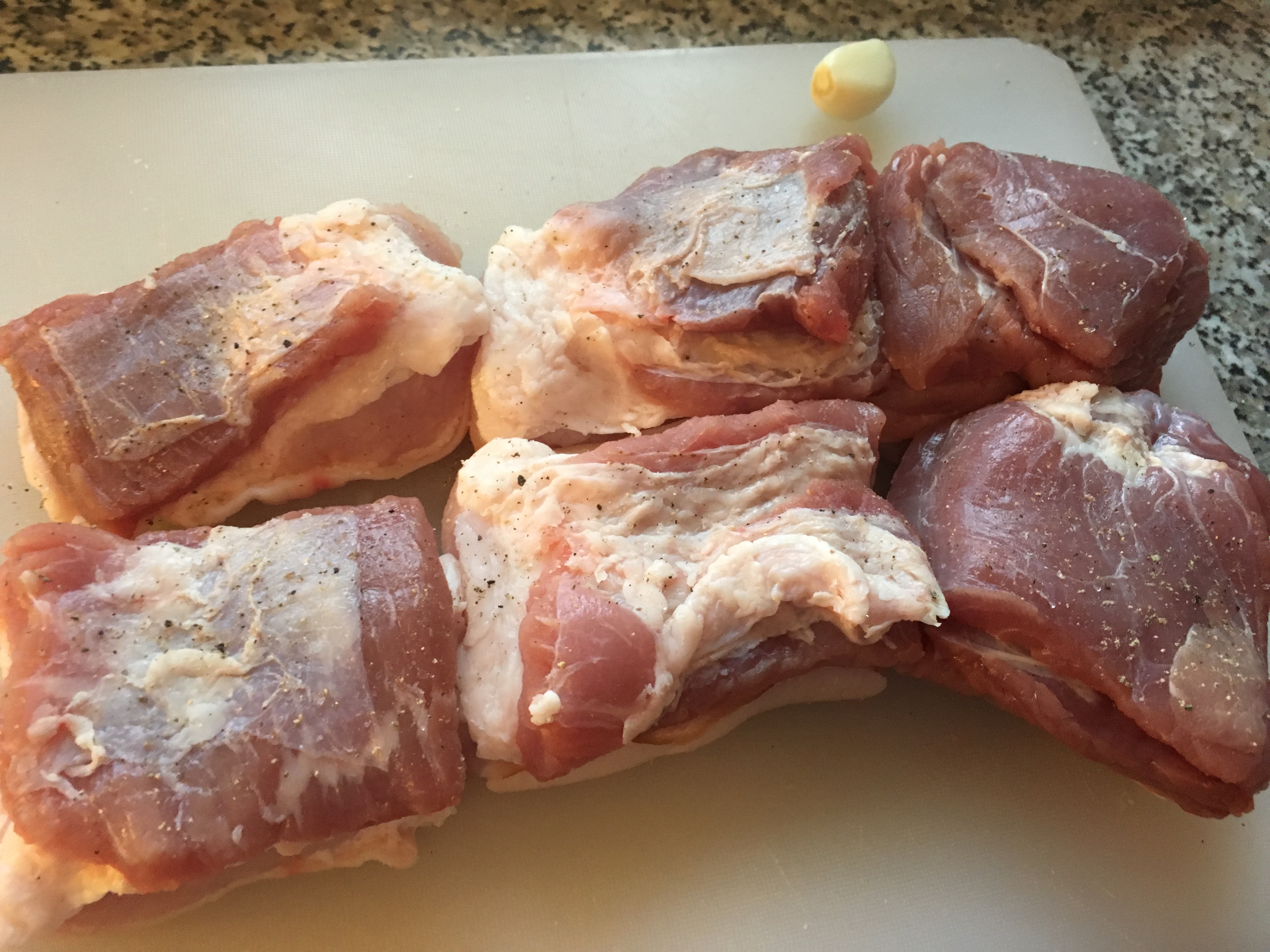 - Den Krustenbraten und das Wammerl in kleinere Stücke schneiden (ca. 6 x 6 cm). Die Fettschicht rautenförmig einschneiden für die Kruste.