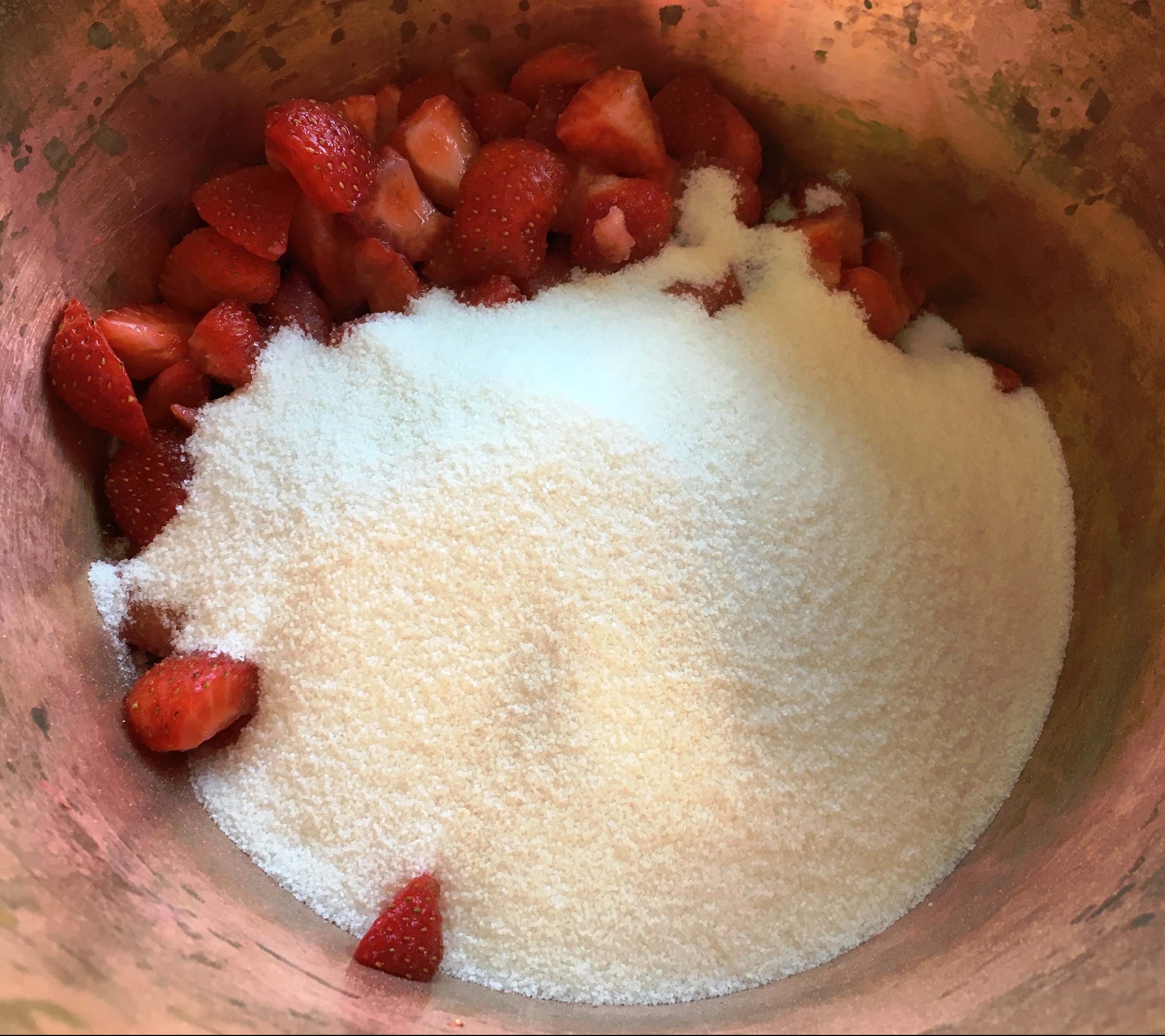 Erdbeeren putzen, kleinschneiden - Dann Gelierzucker dazu und aufkochen. Ein paar Minuten sprudelnd kochen lassen.