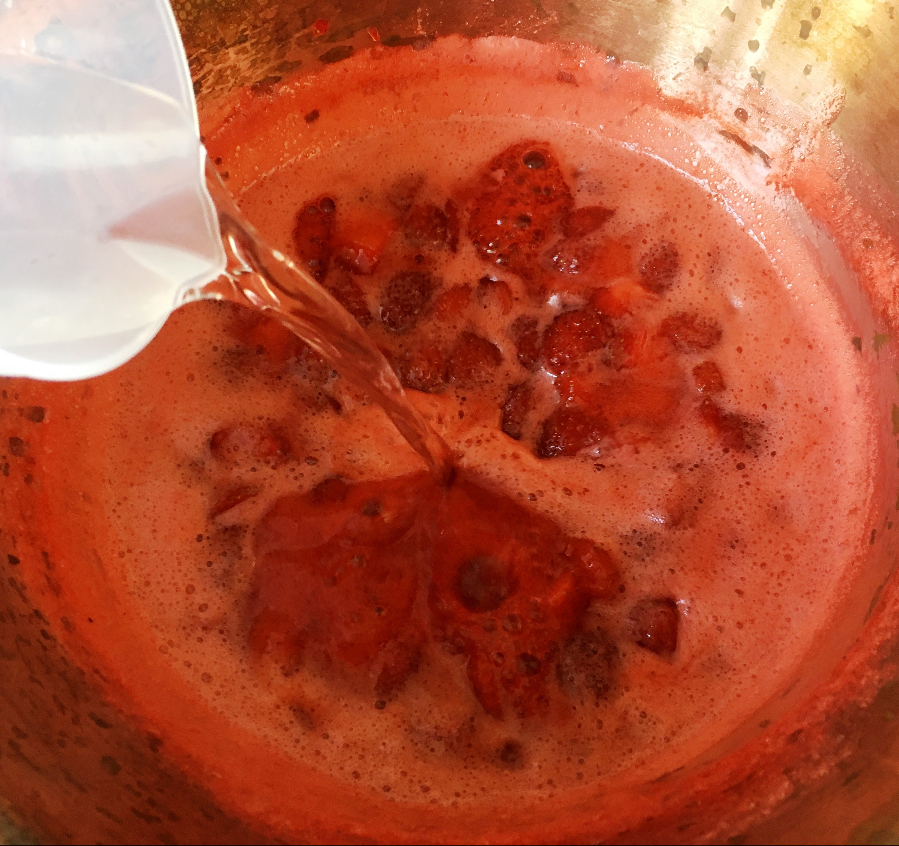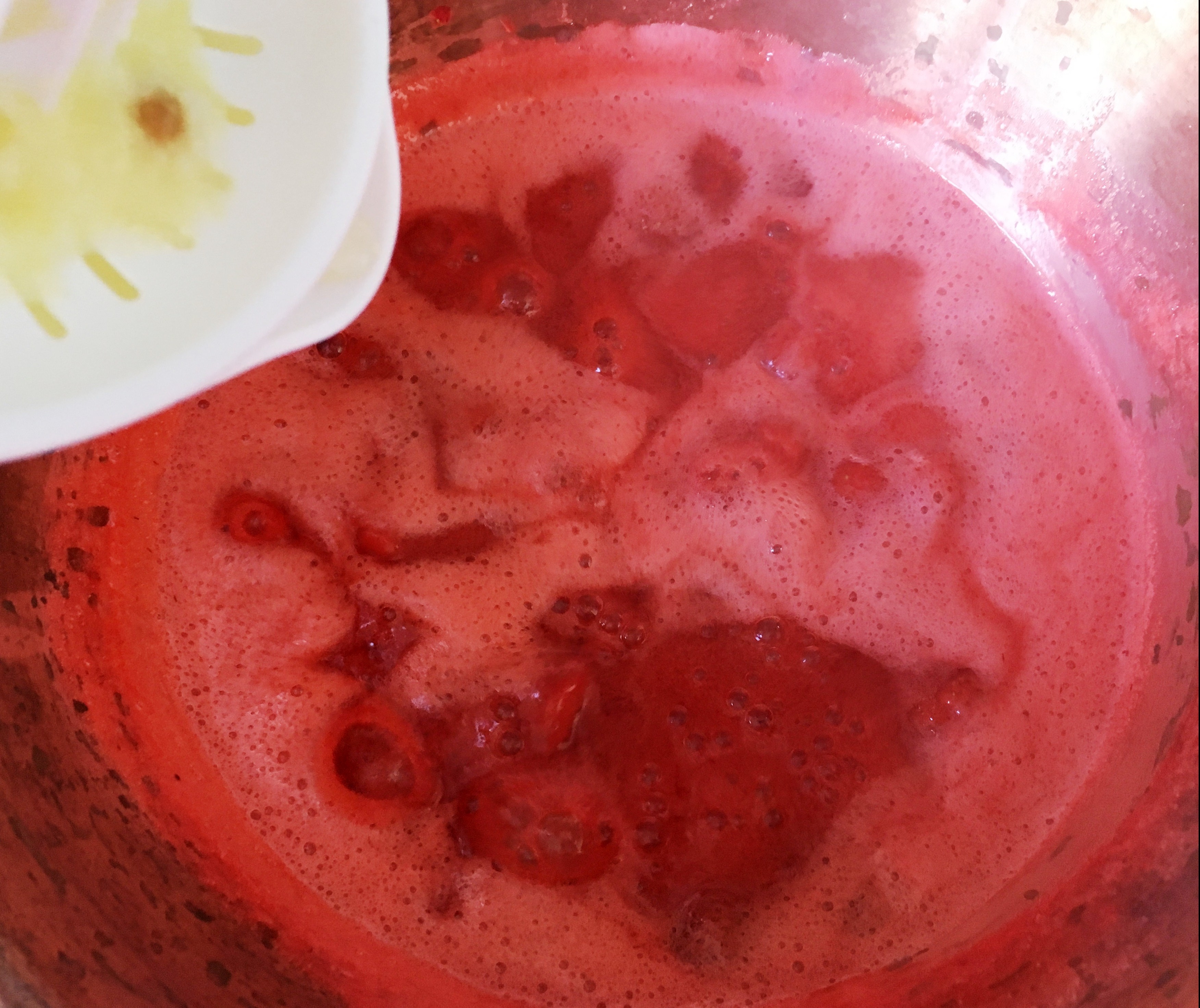 - Am Ende der Kochzeit den Saft einer halben Zitrone und den Wodka in die Marmelade geben. Kurz umrühren