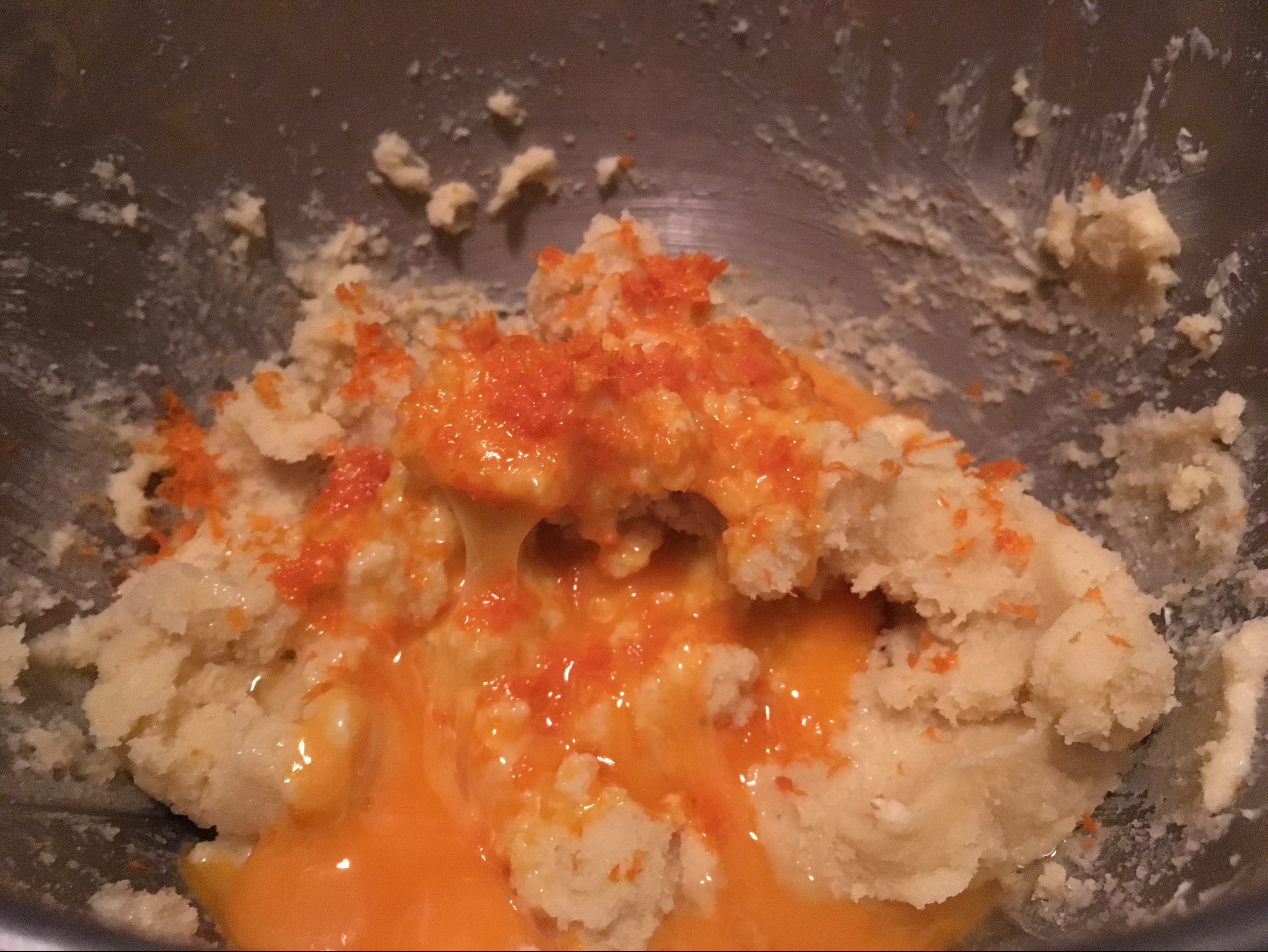 geknetet Mehl, Zucker, Vanillezucker mischen Butter zugeben - Eigelb, Orangenschale und Rum hinzufügen und am besten mit den Händen weiter kneten, bis alle Zutaten gut vermengt sind.
