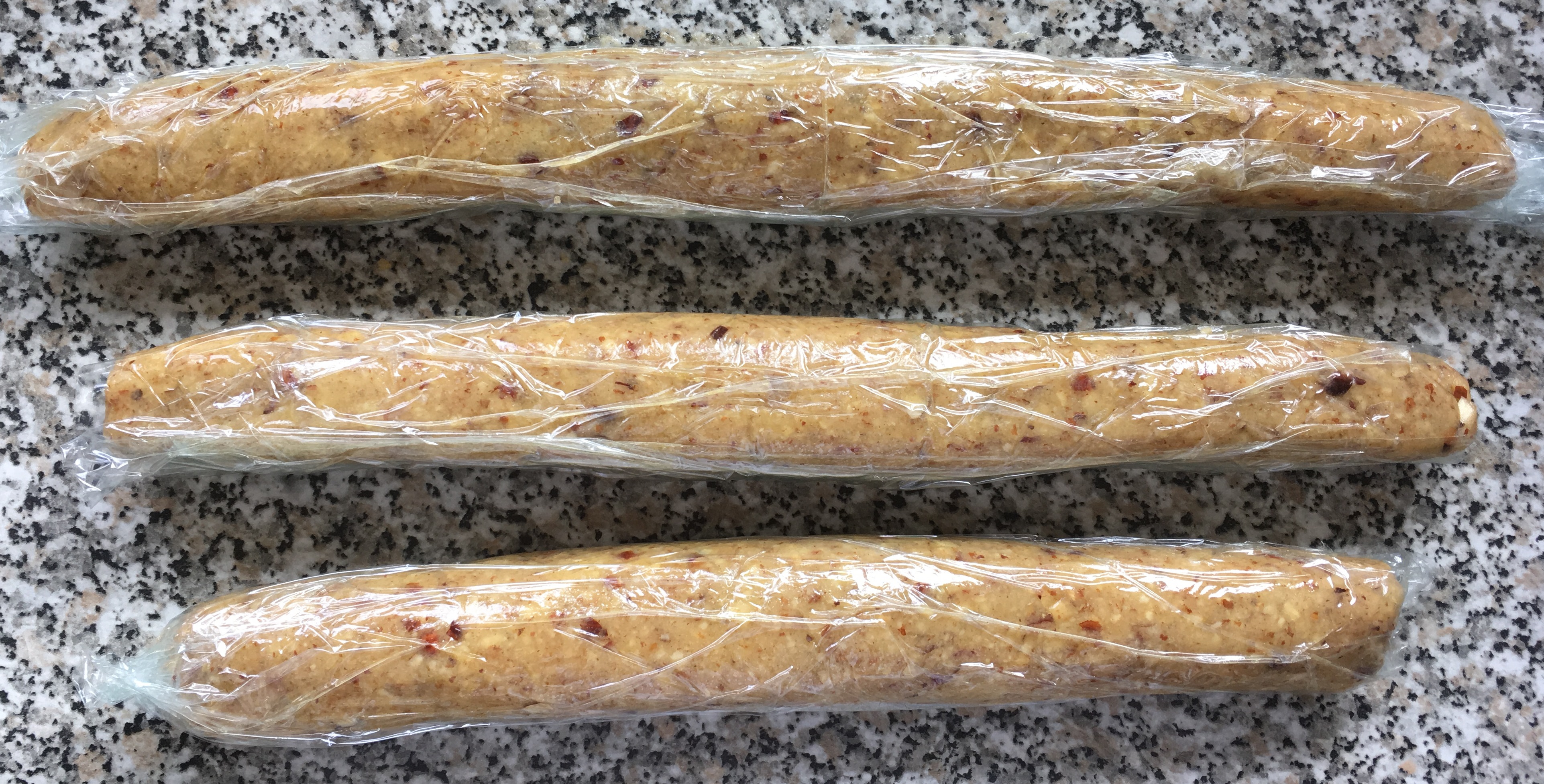 Mehl zugeben Teig kneten - Formen Sie aus dem Teig Rollen mit einem Durchmesser von 2 bis 3 cm. Hier empfiehlt es sich die Rollen in Frischhaltefolie zu verpacken. Damit sind sie nicht nur im Kühlschrank sauber abgelegt, sondern man kann auch nochmal nachrollen. Stellen Sie diese Rollen eine halbe Stunde kalt,