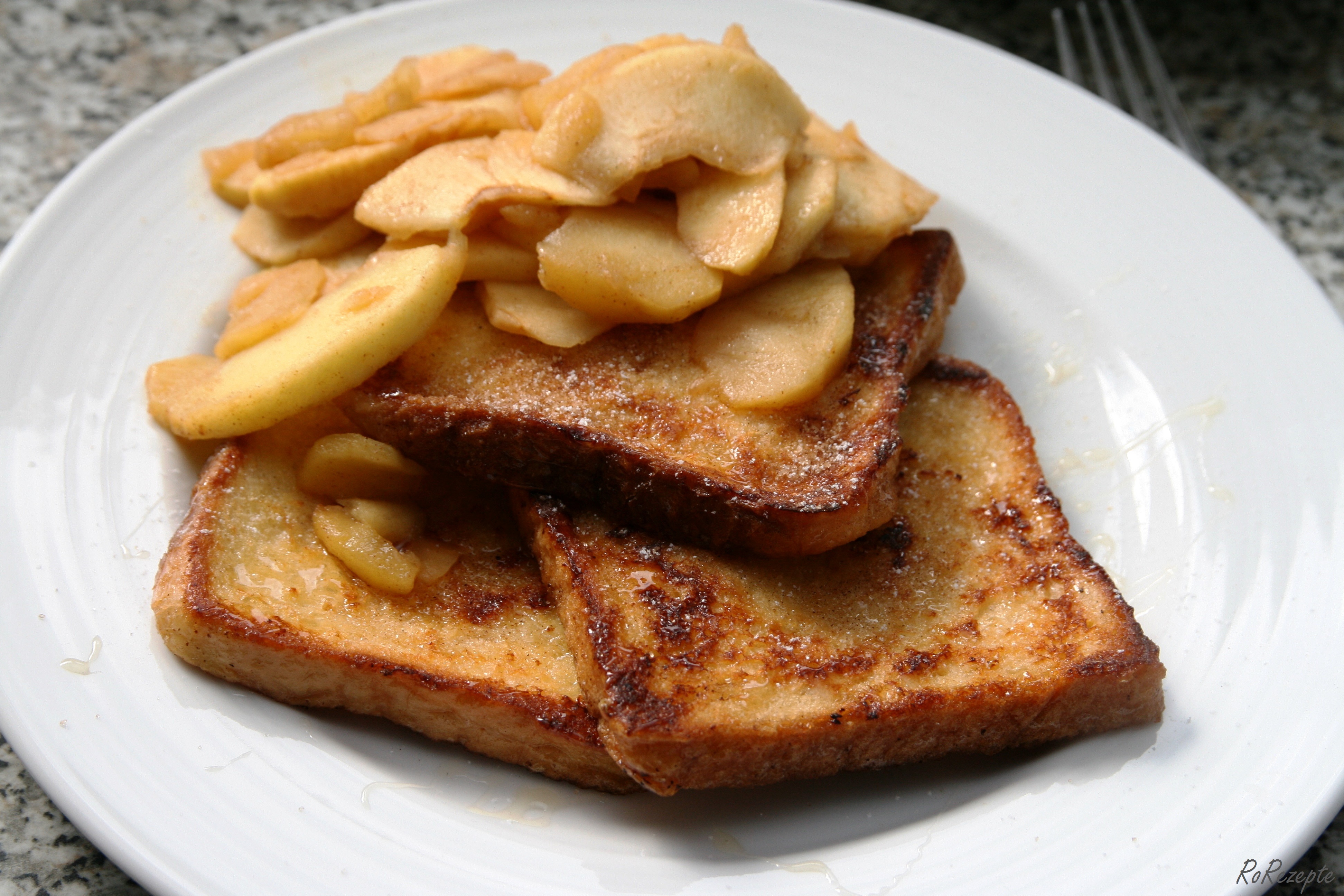 5. Wem die Zimt-Zucker-Variante nicht zusagt, kann den French Toast zusammen mit Puderzucker, Ahornsirup, Speck oder Kompott (zum Beispiel karamellisierte Zimtäpfel, siehe nächstes Rezept) genießen. Eurer Kreativität sind keine Grenzen gesetzt.