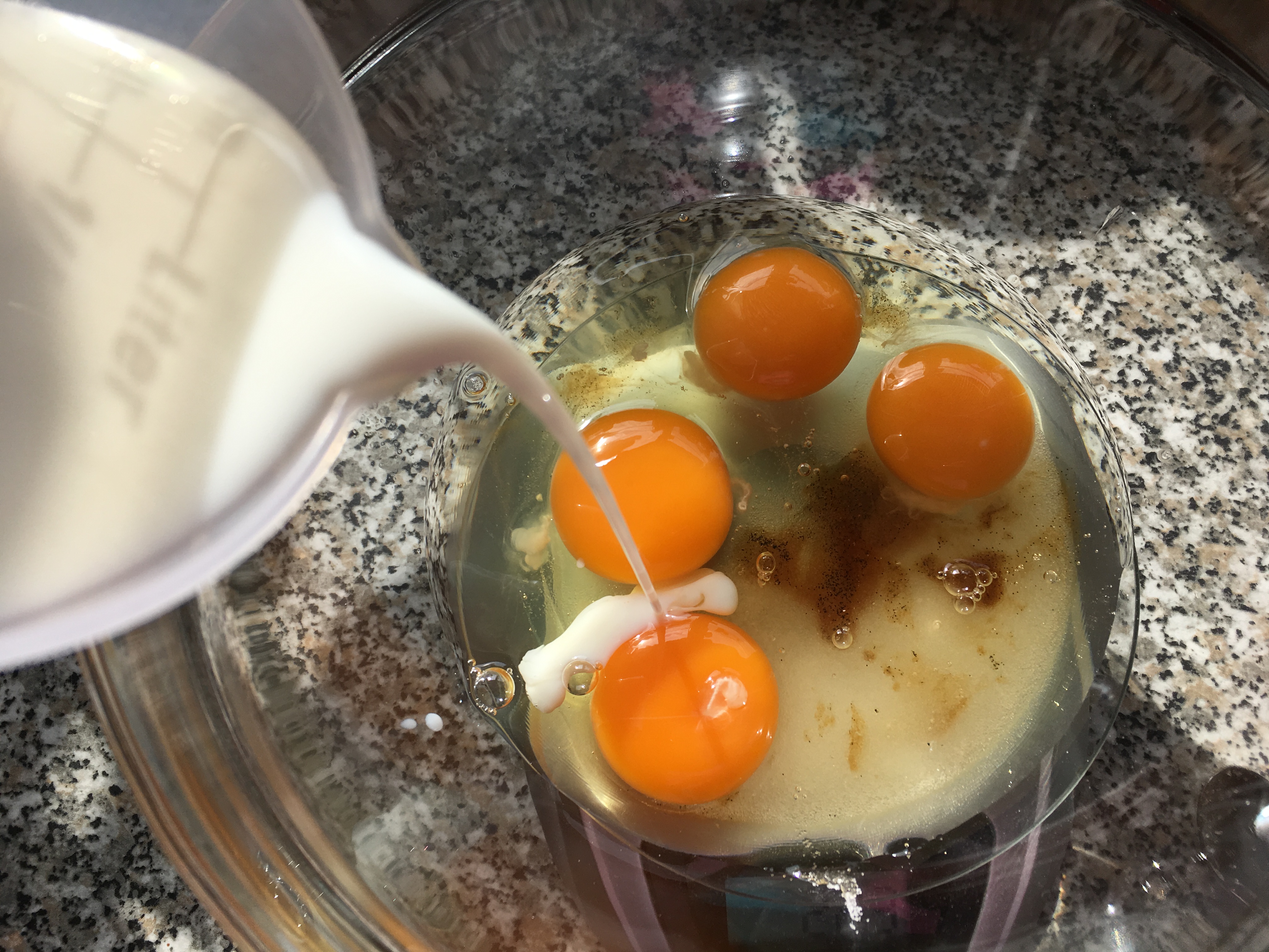 1. Milch, Zucker, Vanille-Extrakt, Salz und Eier miteinander verquirlen.