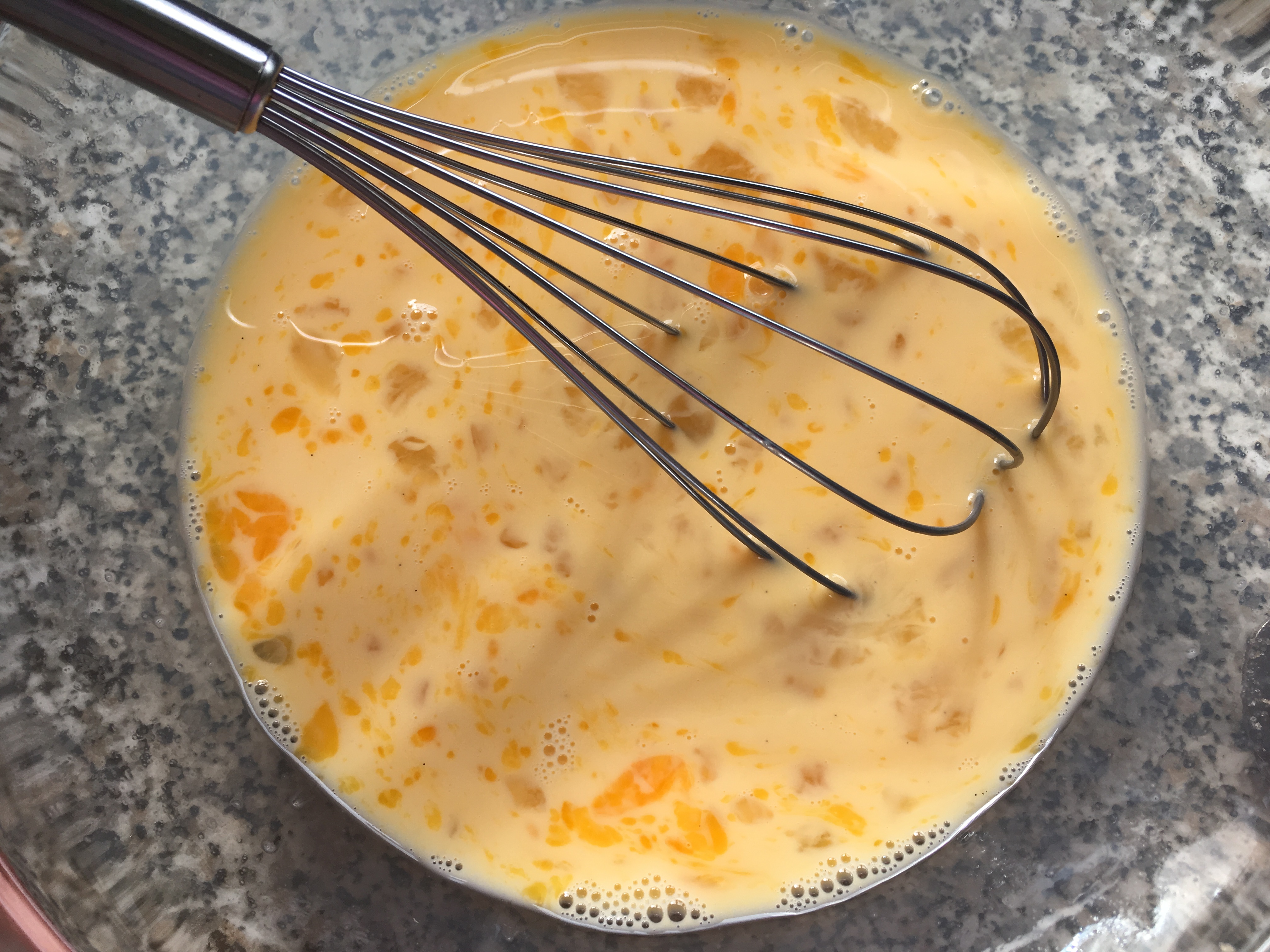 - Milch, Zucker, Vanille-Extrakt, Salz und Eier miteinander verquirlen.