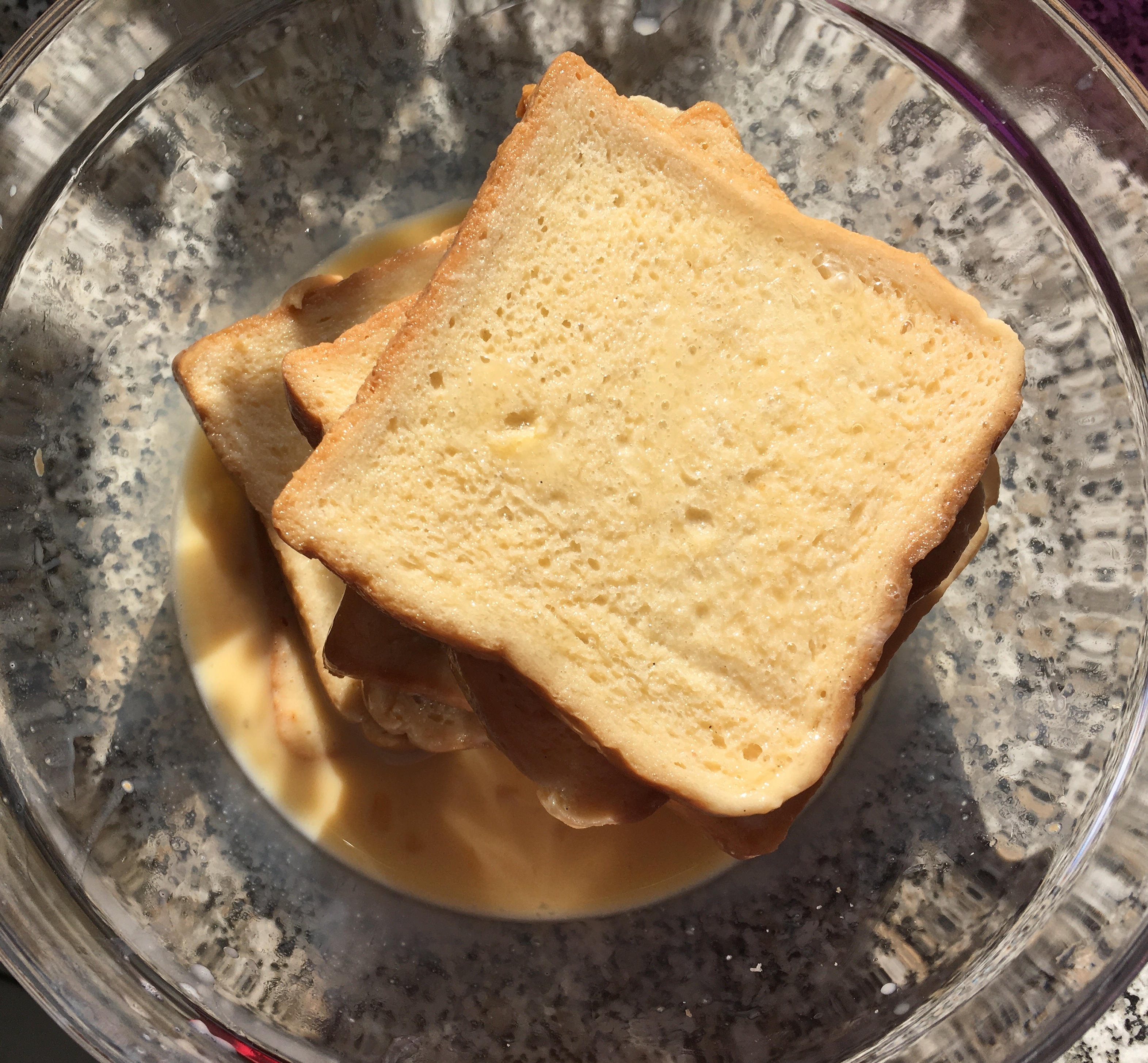 2. Die Brotscheiben in der Mischung tränken, so dass sie sich richtig vollsaugen.