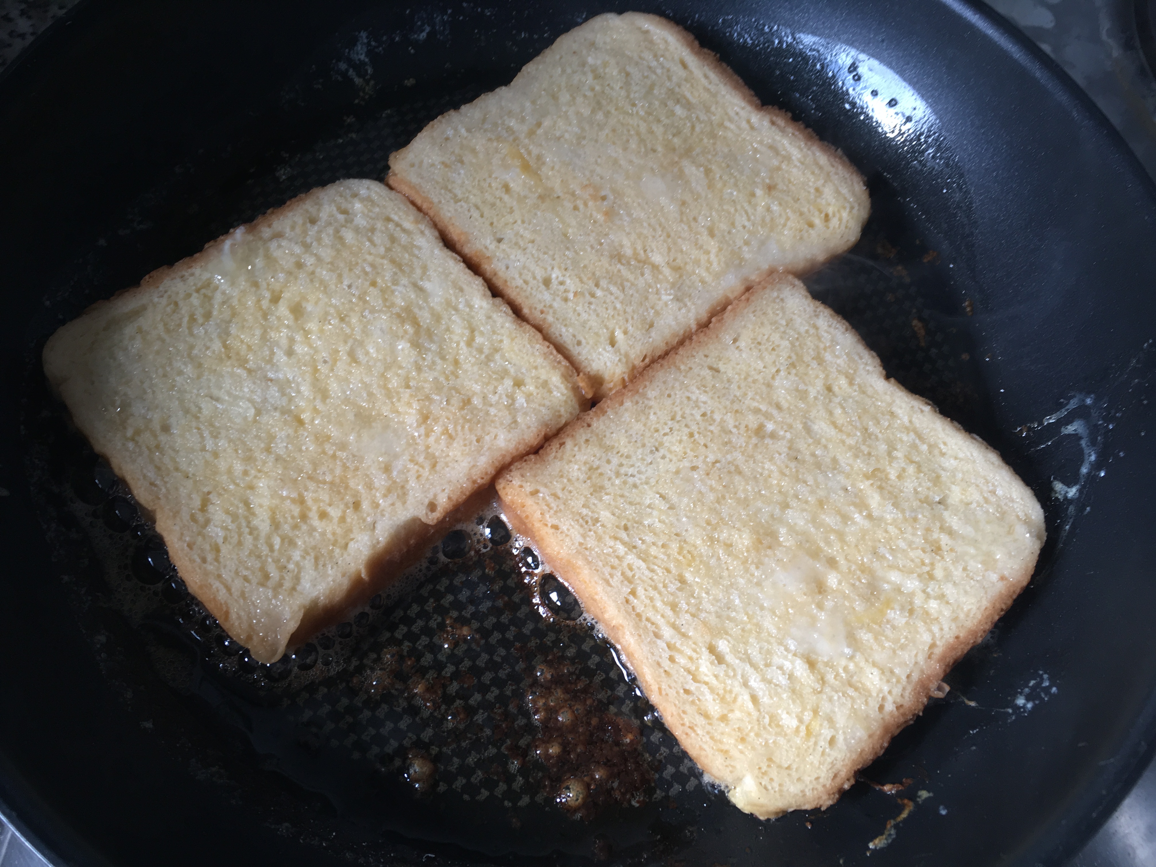 Toastscheiben tränken - Die Butter in einer Bratpfanne erhitzen und die Brotscheiben im heißen Fett goldbraun anbraten.