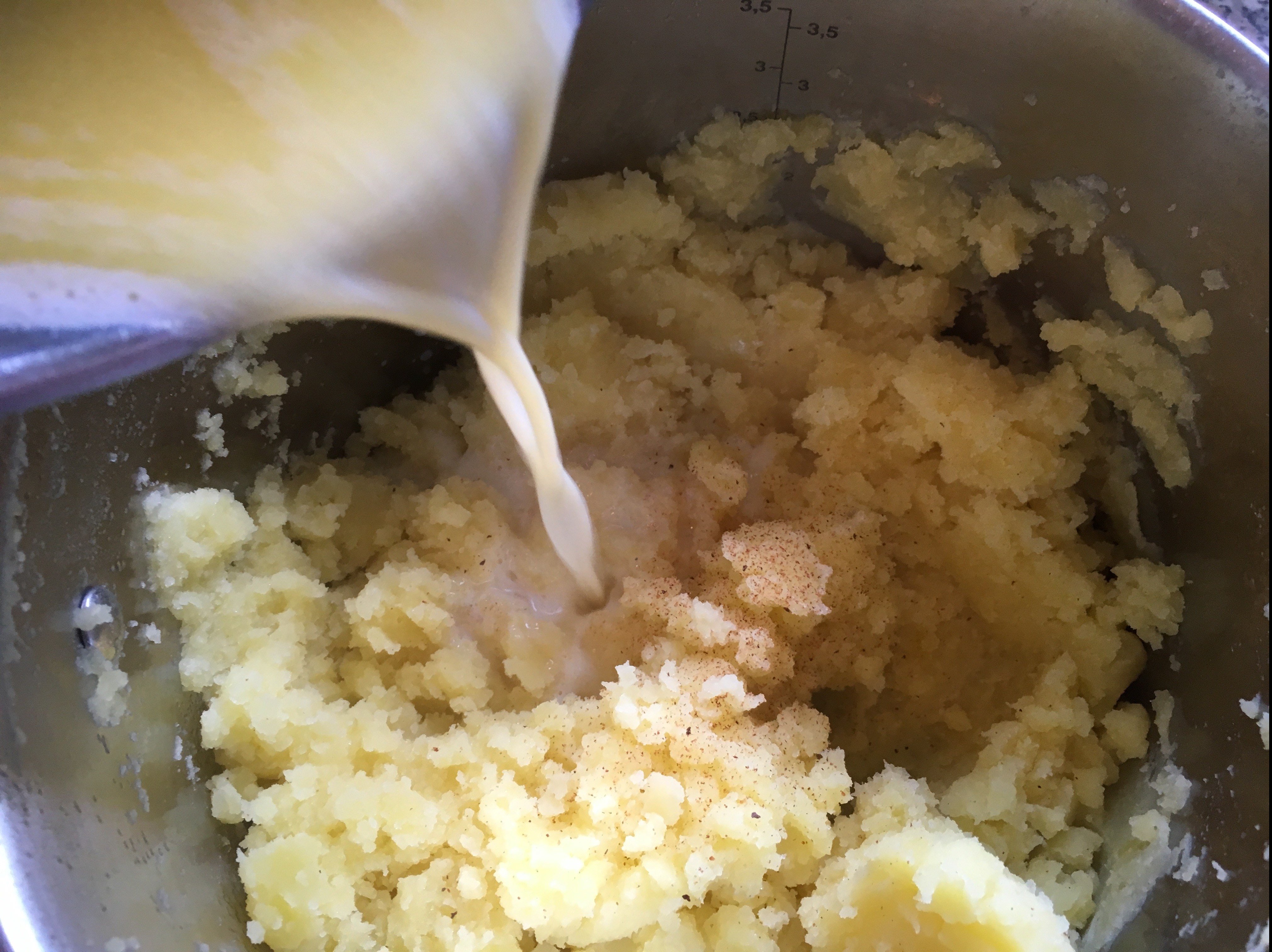 7. Jetzt die (kalte) Sahne hinzufügen. Je nachdem, ob ihr die Stampfkartoffeln lieber etwas trockener oder cremiger mögt, die Menge anpassen. Die 200ml sind ein ungefährer Richtwert.